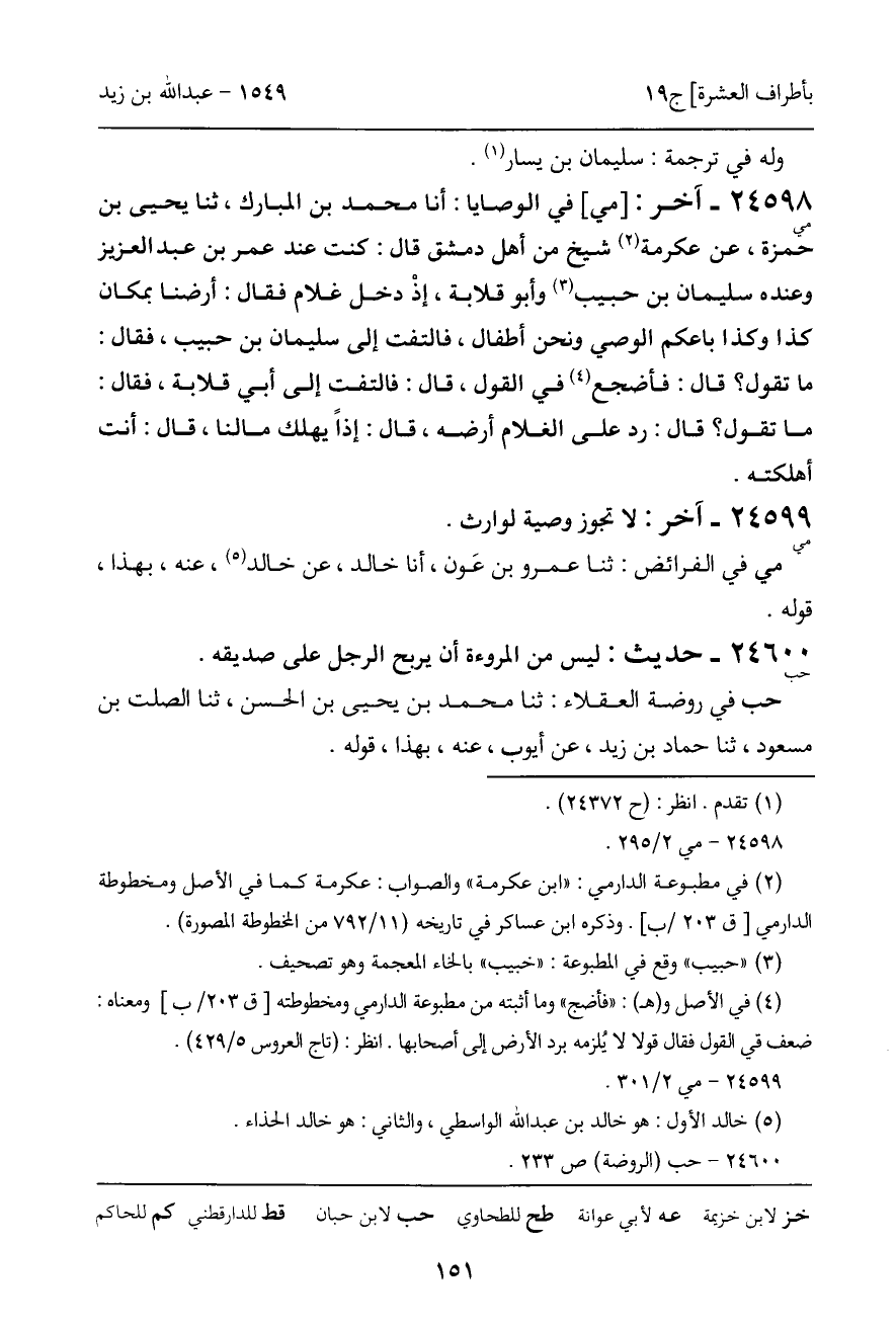 24599 - مي - آخر: لا تجوز وصية لوارث. مي في الفرائض: ثنا عمرو بن عَون، أنا خالد، عن خالد، عنه، بهذا، قوله.