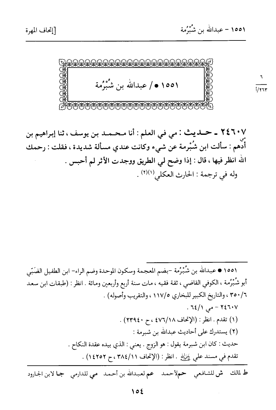 24607 - مي - حديث: مي في العلم: أنا محمد بن يوسف، ثنا إبراهيم بن أدهم: سألت ابن شُبْرمة عن شيء وكانت عندي مسألة شديدة، فقلت: رحمك الله انظر فيها، قال: إذا وضح لي الطريق ووجدت الأثر لم أحبس. وله في ترجمة: الحارث العكلي.