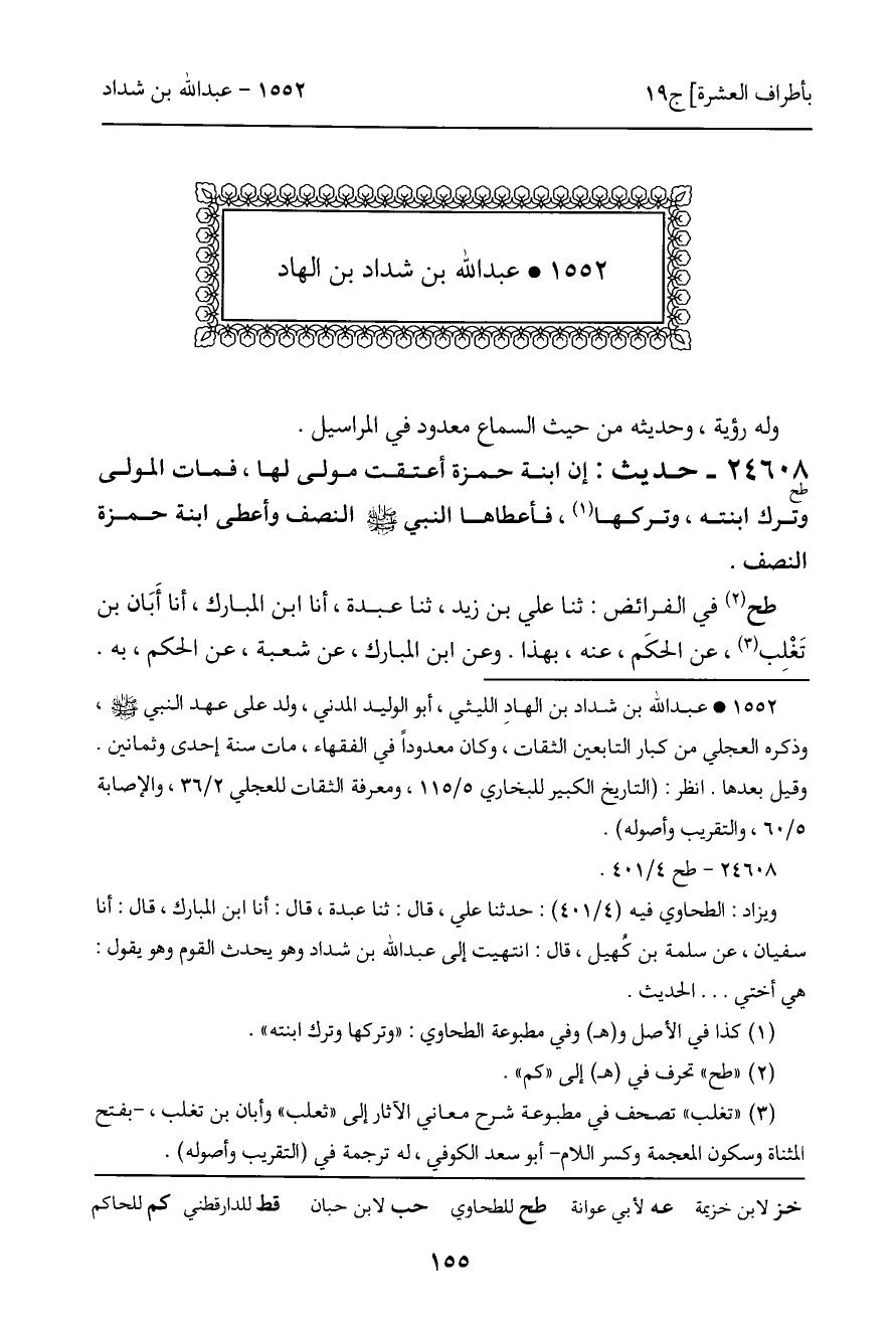 24608 - طح - حديث: إن ابنة حمزة أعتقت مولى لها، فمات المولى وترك ابنته، وتركها، فأعطاها النبي صلى الله عليه وسلم النصف وأعطى ابنة حمزة النصف. طح في الفرائض: ثنا علي بن زيد، ثنا عبدة، أنا ابن المبارك، أنا أَبَان بن تَغْلِب، عن الحكَم، عنه، بهذا. وعن ابن المبارك، عن شعبة، عن الحكم، به.