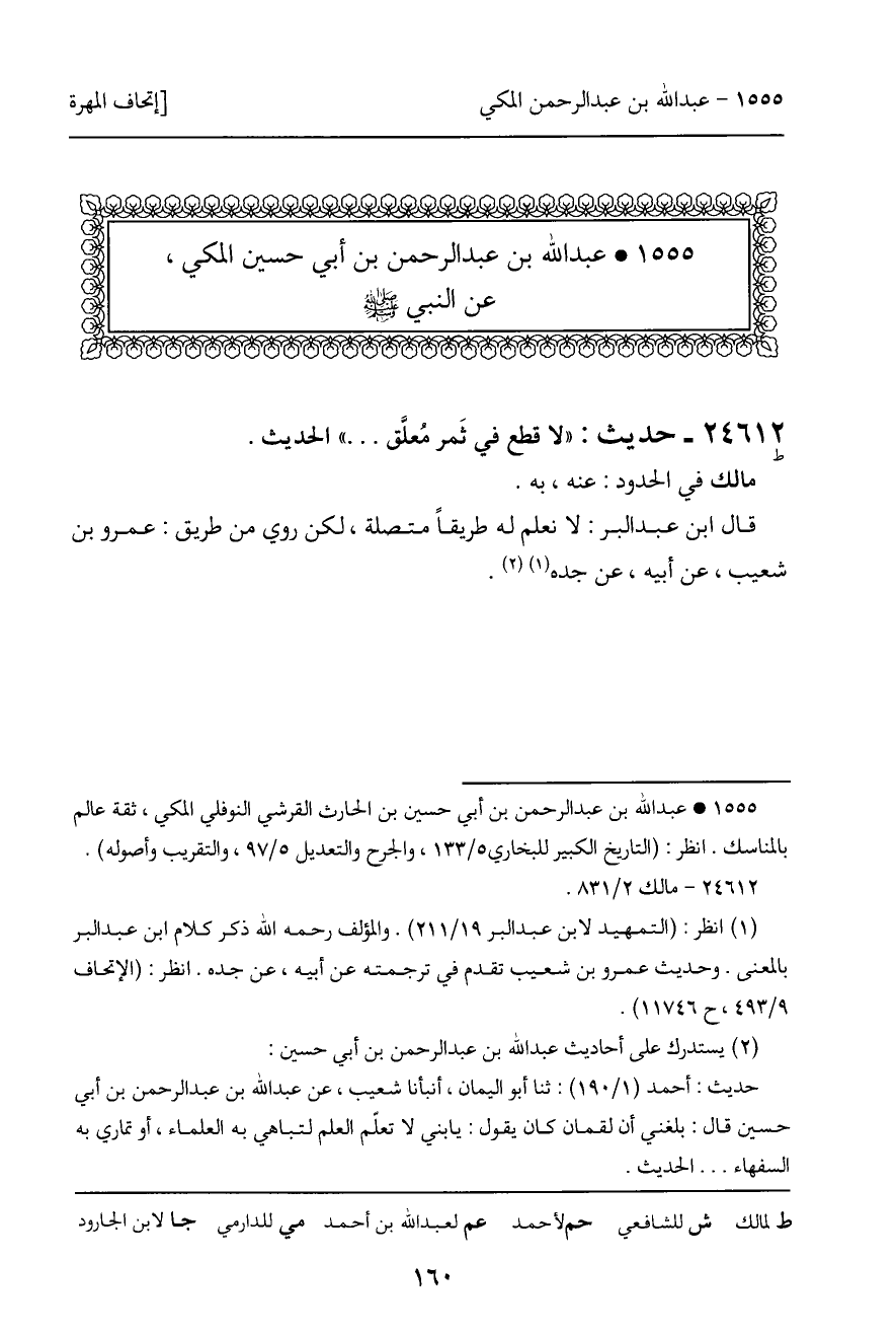 24612 - ط - حديث: ((لا قطع في ثَمر مُعلَّق ... )) الحديث. مالك في الحدود: عنه، به. قال ابن عبد البر: لا نعلم له طريقاً متصلة، لكن روي من طريق: عمرو بن شعيب، عن أبيه، عن جده.