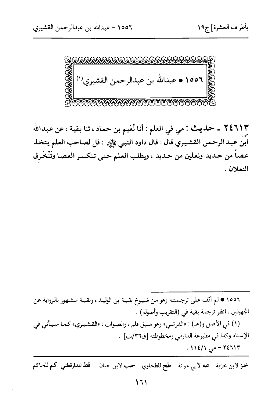 24613 - مي - حديث: مي في العلم: أنا نُعَيم بن حماد، ثنا بقية، عن عبد الله ابن عبد الرحمن القشيري قال: قال داود النبي صلى الله عليه وسلم: قل لصاحب العلم يتخذ عصاً من حديد ونعلين من حديد، ويطلب العلم حتى تنكسر العصا وتَنْخَرِق النعلان.