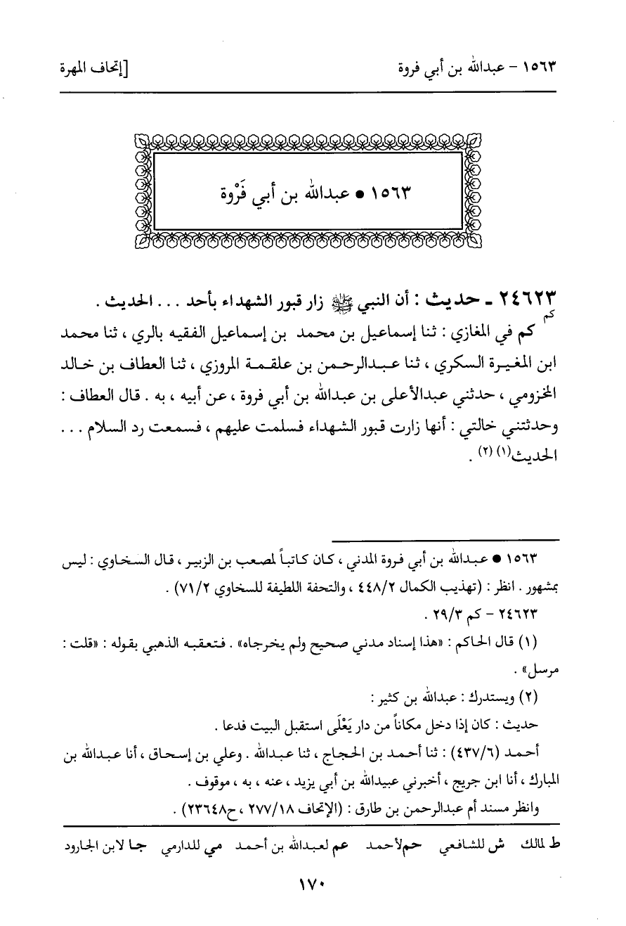 24623 - كم - حديث: أن النبي صلى الله عليه وسلم زار قبور الشهداء بأحد ... الحديث. كم في المغازي: ثنا إسماعيل بن محمد بن إسماعيل الفقيه بالري، ثنا محمد ابن المغيرة السكري، ثنا عبد الرحمن بن علقمة المروزي، ثنا العطاف بن خالد المخزومي، حدثني عبد الأعلى بن عبد الله بن أبي فروة، عن أبيه، به. قال العطاف: وحدثتني خالتي: أنها زارت قبور الشهداء فسلمت عليهم، فسمعت رد السلام ... الحديث.
