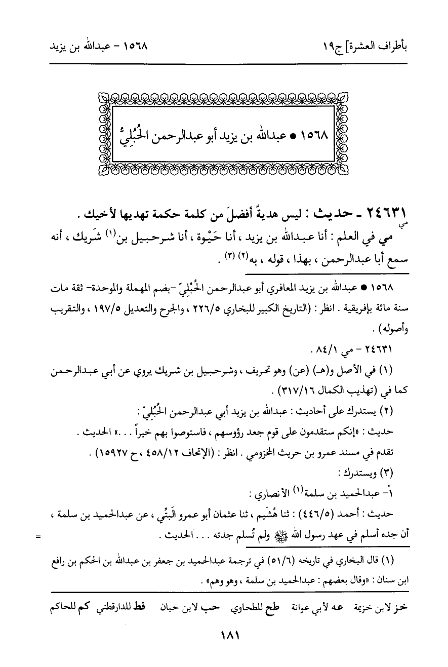 24631 - مي - حديث: ليس هديةٌ أفضلَ من كلمة حكمة تهديها لأخيك. مي في العلم: أنا عبد الله بن يزيد، أنا حَيْوة، أنا شرحبيل بن شَريك، أنه سمع أبا عبد الرحمن، بهذا، قوله، به.
