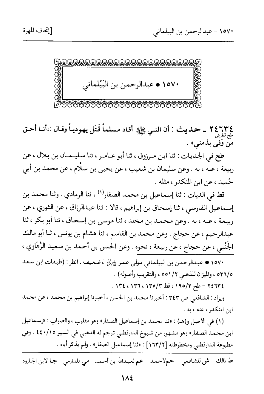 24634 - طح قط ش - حديث: أن النبي صلى الله عليه وسلم أقاد مسلماً قَتَل يهودياً وقال: ((أنا أحق من وَفَى بذمتي)) . طح في الجنايات: ثنا ابن مرزوق، ثنا أبو عامر، ثنا سليمان بن بلال، عن ربيعة، عنه، به. وعن سليمان بن شعيب، عن يحيى بن سلَّام، عن محمد بن أبي حُميد، عن ابن المنكدر، مثله. قط في الديات: ثنا إسماعيل بن محمد الصفار، ثنا الرمادي. وثنا محمد بن إسماعيل الفارسي، ثنا إسحاق بن إبراهيم، قالا: ثنا عبد الرزاق، عن الثوري، عن ربيعة، عنه، به. وعن محمد بن مخلد، ثنا موسى بن إسحاق، ثنا أبو بكر، ثنا عبد الرحيم، عن حجاج. وعن محمد بن القاسم، ثنا هشام بن يونس، ثنا أبو مالك الجَنْبي، عن حجاج، عن ربيعة، نحوه. وعن الحسن بن أحمد بن سعيد الرُّهَاوي،