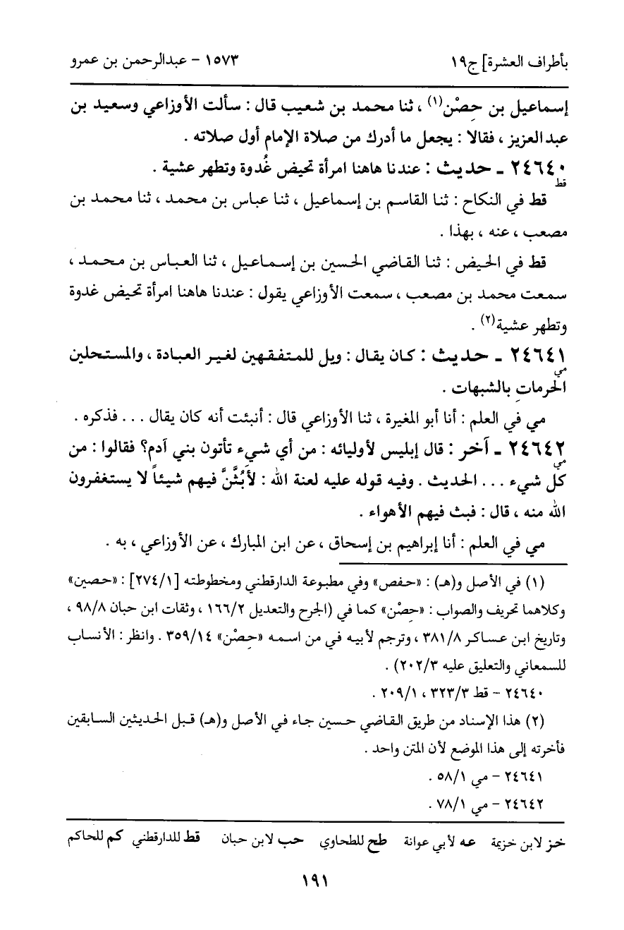 24640 - قط - حديث: عندنا هاهنا امرأة تحيض غُدوة وتطهر عشية. قط في النكاح: ثنا القاسم بن إسماعيل، ثنا عباس بن محمد، ثنا محمد بن مصعب، عنه، بهذا. قط في الحيض: ثنا القاضي الحسين بن إسماعيل، ثنا العباس بن محمد، سمعت محمد بن مصعب، سمعت الأوزاعي يقول: عندنا هاهنا امرأة تحيض غدوة وتطهر عشية.