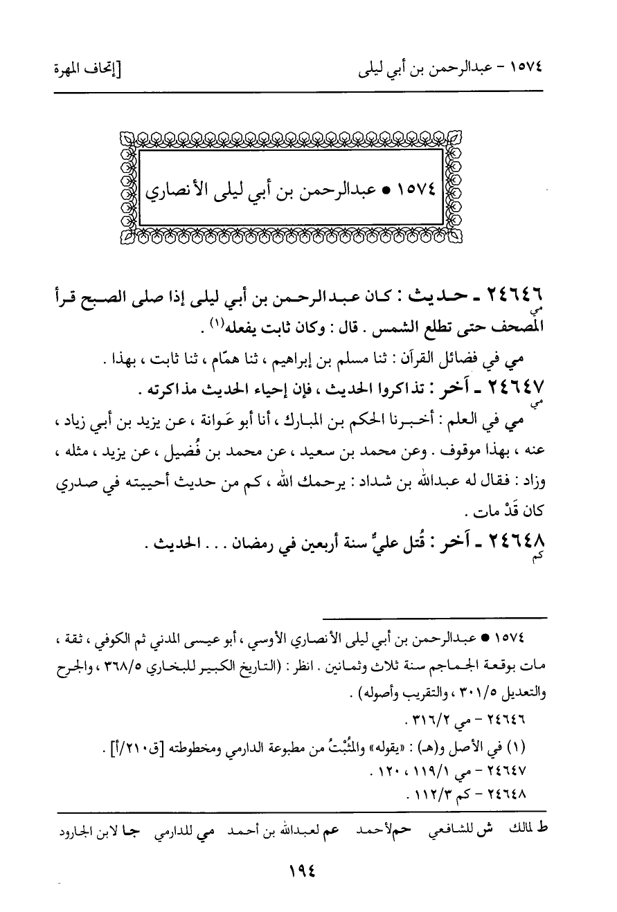 24646 - مي - حديث: كان عبد الرحمن بن أبي ليلى إذا صلى الصبح قرأ المصحف حتى تطلع الشمس. قال: وكان ثابت يفعله. مي في فضائل القرآن: ثنا مسلم بن إبراهيم، ثنا همّام، ثنا ثابت، بهذا.