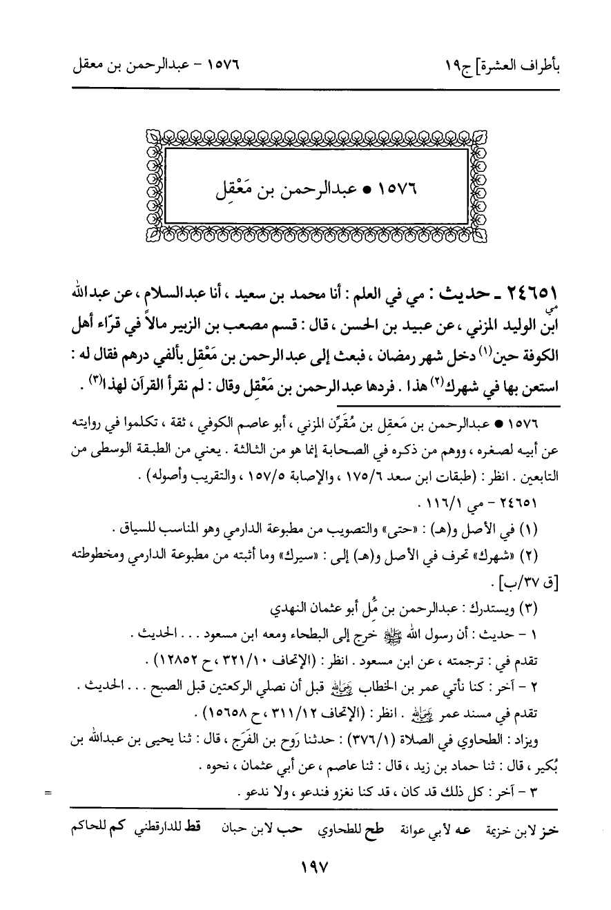 24651 - مي - حديث: مي في العلم: أنا محمد بن سعيد، أنا عبد السلام، عن عبد الله ابن الوليد المزني، عن عبيد بن الحسن، قال: قسم مصعب بن الزبير مالاً في قرّاء أهل الكوفة حين دخل شهر رمضان، فبعث إلى عبد الرحمن بن مَعْقِل بألفي درهم فقال له: استعن بها في شهرك هذا. فردها عبد الرحمن بن مَعْقِل وقال: لم نقرأ القرآن لهذا.