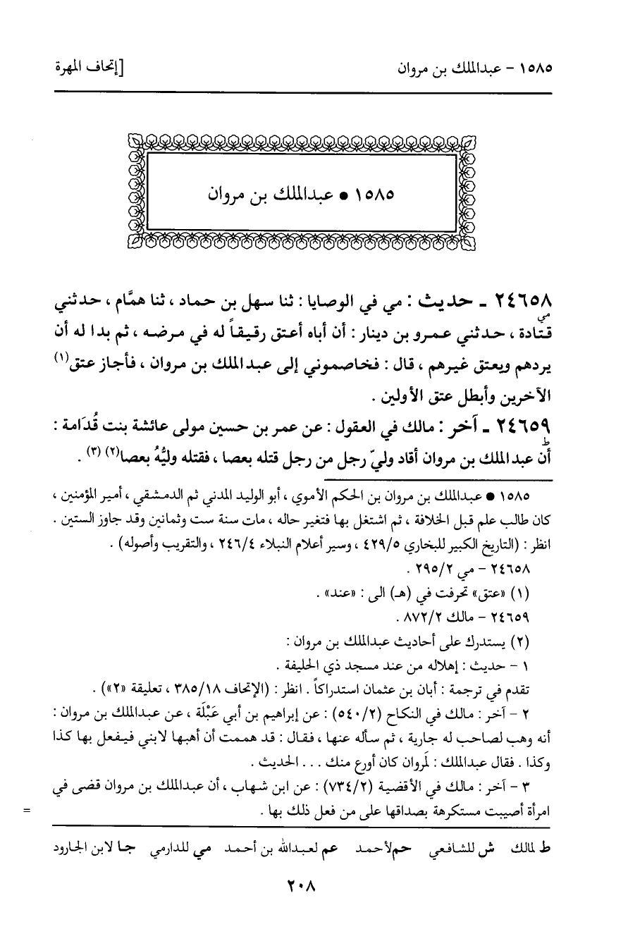24658 - مي - حديث: مي في الوصايا: ثنا سهل بن حماد، ثنا همَّام، حدثني قتادة، حدثني عمرو بن دينار: أن أباه أعتق رقيقاَ له في مرضه، ثم بدا له أن يردهم ويعتق غيرهم، قال: فخاصموني إلى عبد الملك بن مروان، فأجاز عتق الآخرين وأبطل عتق الأولين.