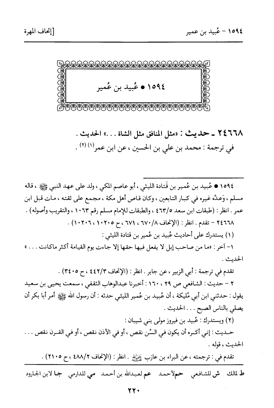 24668 - حديث: ((مثل المنافق مثل الشاة ... )) الحديث. في ترجمة: محمد بن علي بن الحسين، عن ابن عمر.