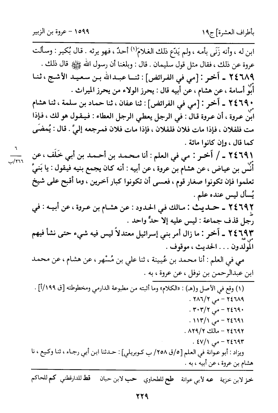 24693 - مي عه - آخر: ما زال أمر بني إسرائيل معتدلاً ليس فيه شيء حتى نشأ فيهم المولدون ... الحديث، موقوف. مي في العلم: أنا محمد بن عُيينة، ثنا علي بن مُسْهر، عن هشام، عن محمد ابن عبد الرحمن بن نوفل، عن عروة، به.