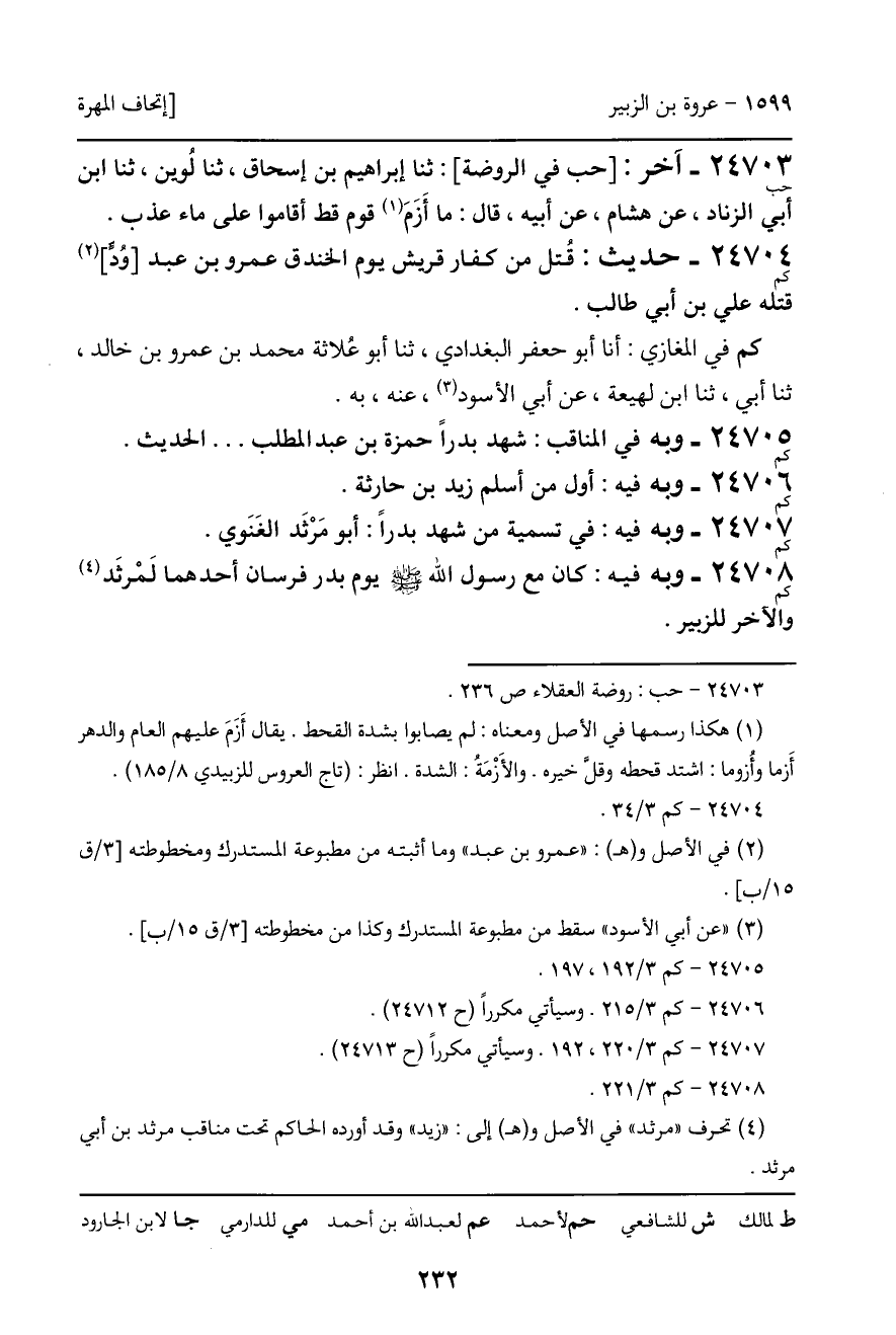 24708 - كم - وبه فيه: كان مع رسول الله صلى الله عيه وسلم يوم بدر فرسان أحدهما لَمْرثَد والآخر للزبير.
