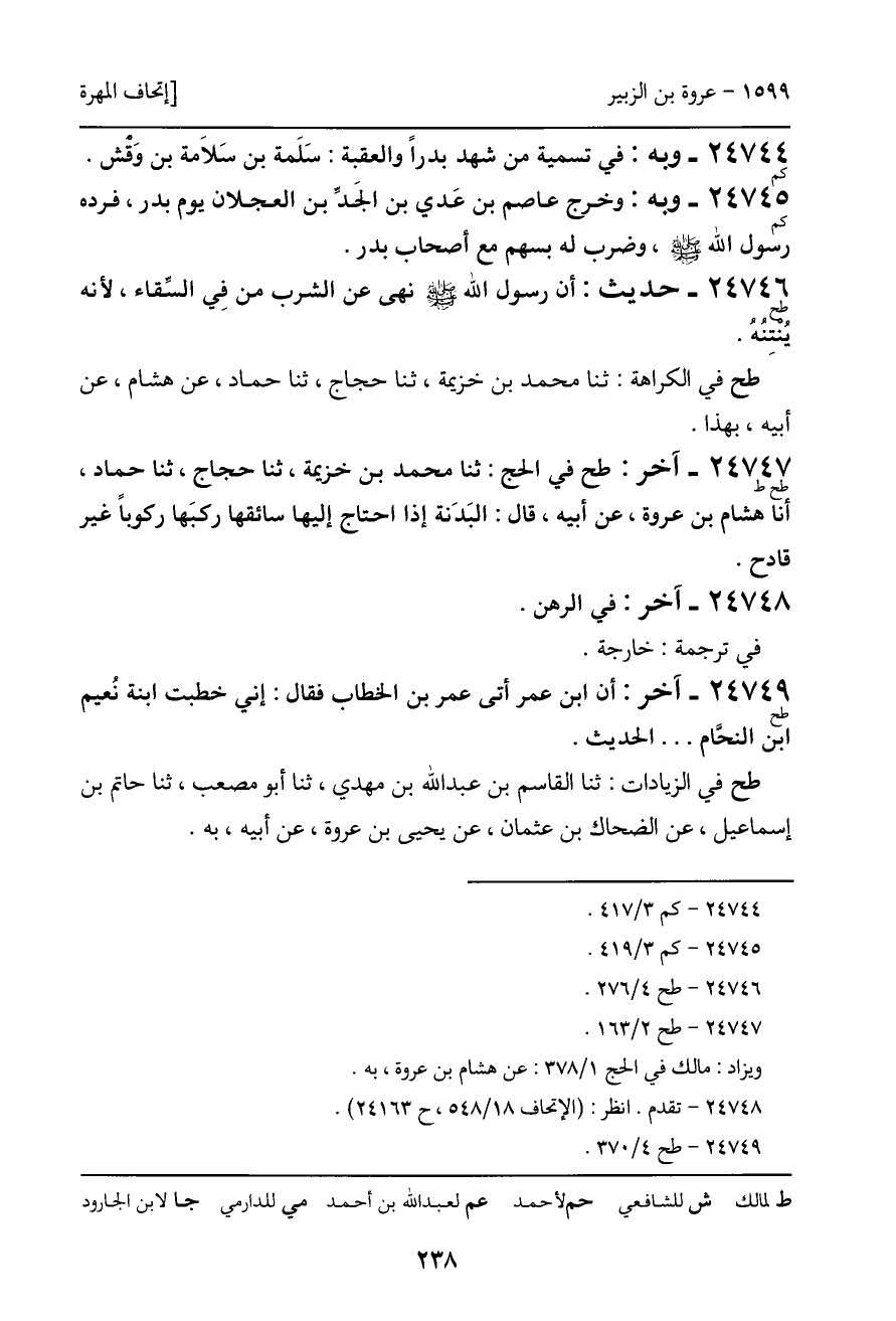 24749 - طح - آخر: أن ابن عمر أتى عمر بن الخطاب فقال: إني خطبت ابنة نُعيم ابن النحَّام ... الحديث. طح في الزيادات: ثنا القاسم بن عبد الله بن مهدي، ثنا أبو مصعب، ثنا حاتم بن إسماعيل، عن الضحاك بن عثمان، عن يحيى بن عروة، عن أبيه، به.