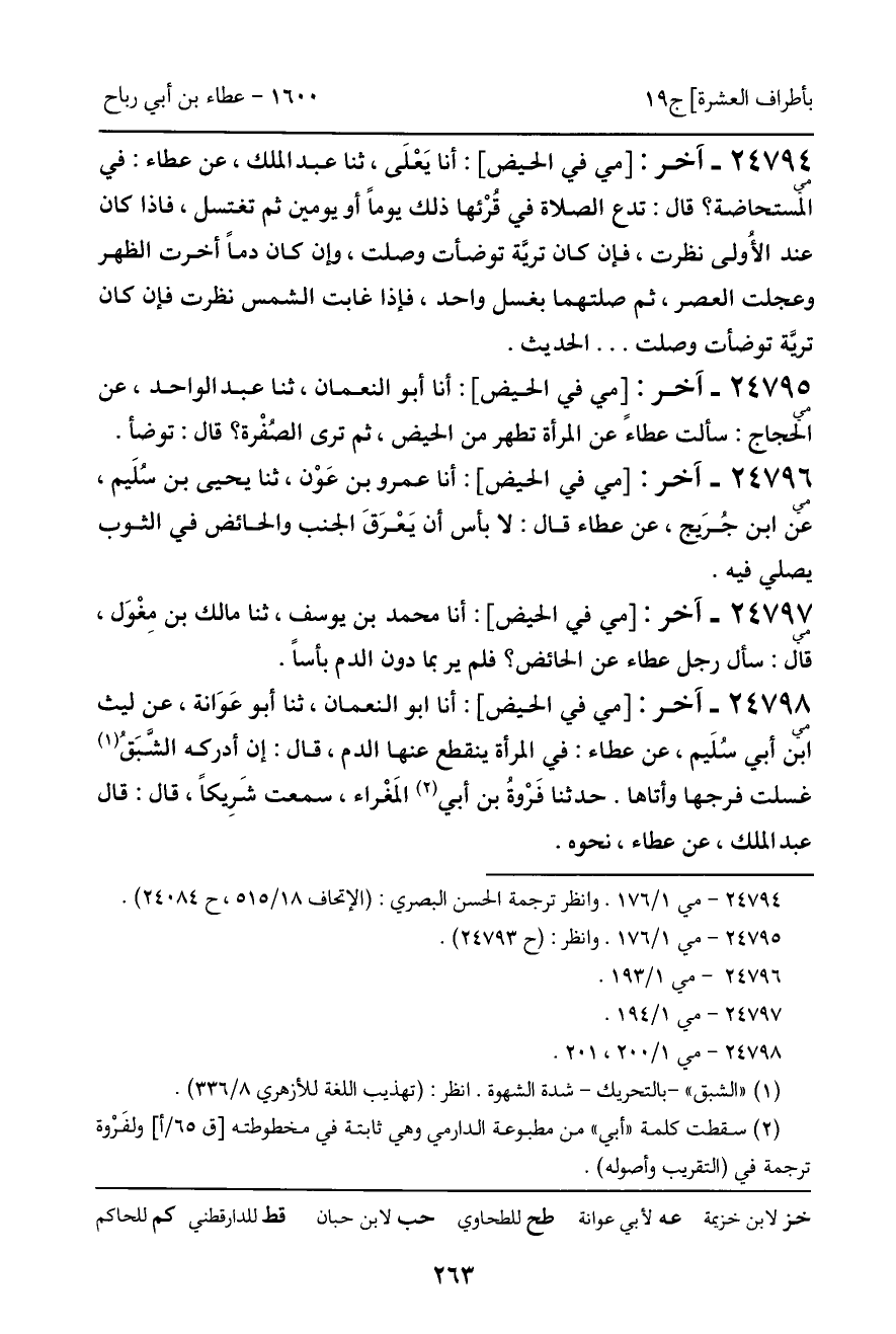 24795 - مي - آخر: [مي في الحيض] : أنا أبو النعمان، ثنا عبد الواحد، عن الحجاج: سألت عطاءً عن المرأة تطهر من الحيض، ثم ترى الصُفْرة؟ قال: توضأ.