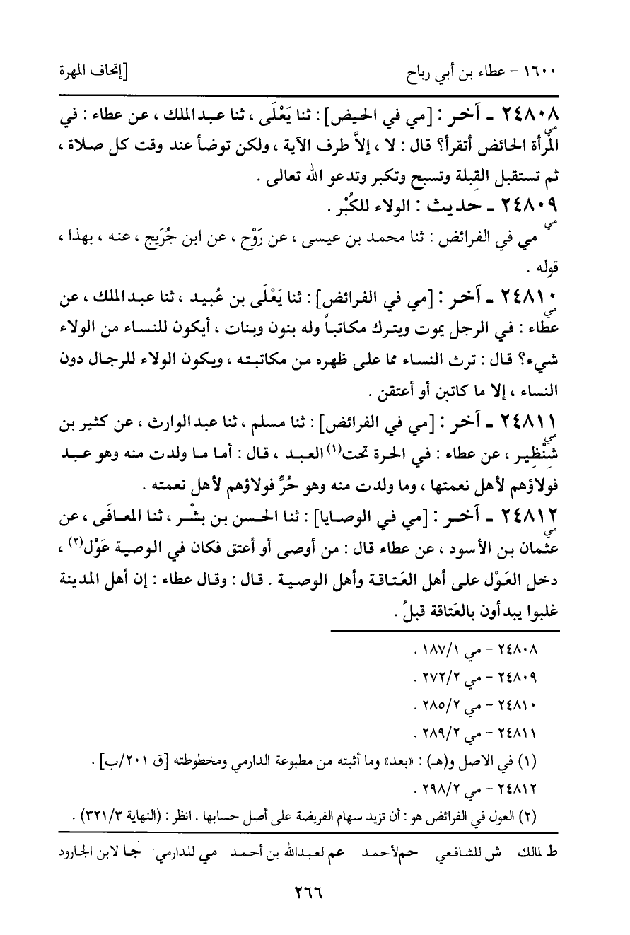 24809 - مي - حديث: الولاء للكُبْر. مي في الفرائض: ثنا محمد بن عيسى، عن رَوْح، عن ابن جُرَيج، عنه، بهذا، قوله.