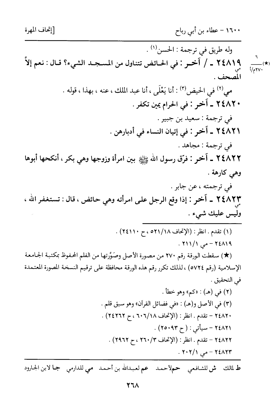 24819 - مي - /آخر: في الحائض تتناول من المسجد الشيء؟ قال: نعم إلاَّ المصحف. مي في الحيض: أنا يَعْلَى، أنا عبد الملك، عنه، بهذا، قوله.