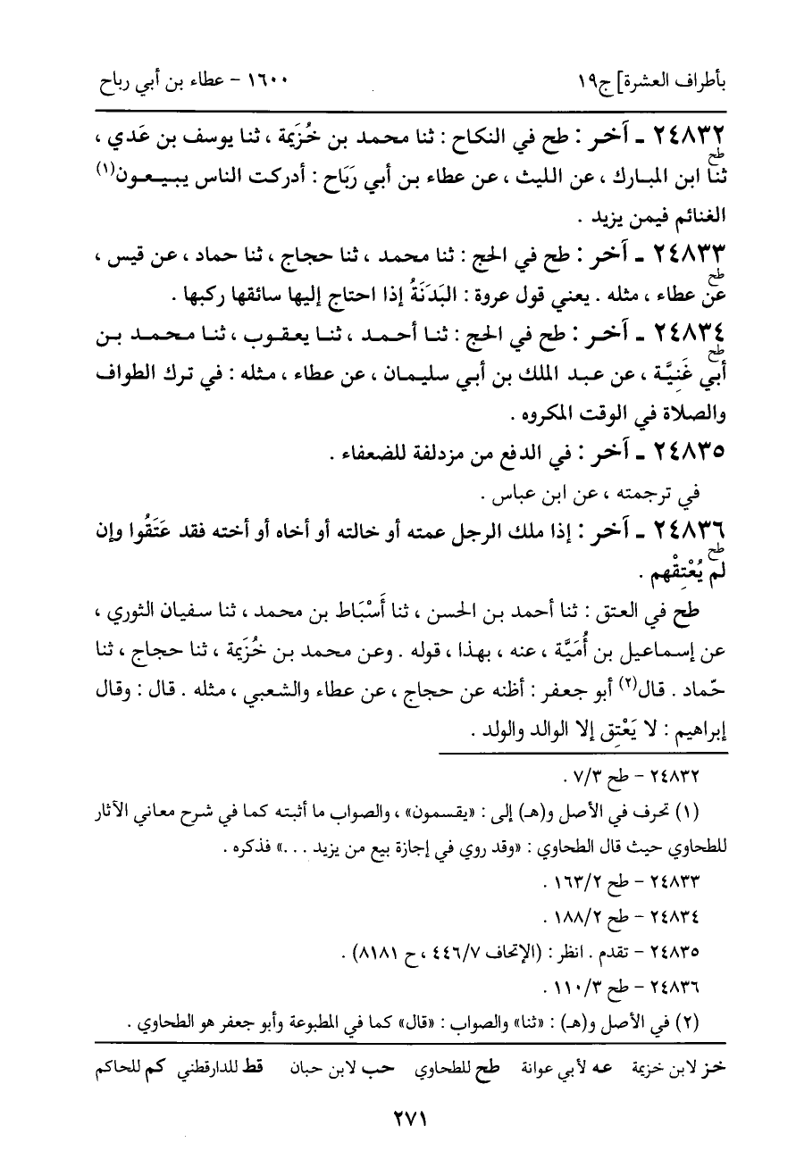 24832 - طح - آخر: طح في النكاح: ثنا محمد بن خُزَيمة، ثنا يوسف بن عَدي، ثنا ابن المبارك، عن الليث، عن عطاء بن أبي رَبَاح: أدركت الناس يبيعون الغنائم فيمن يزيد.