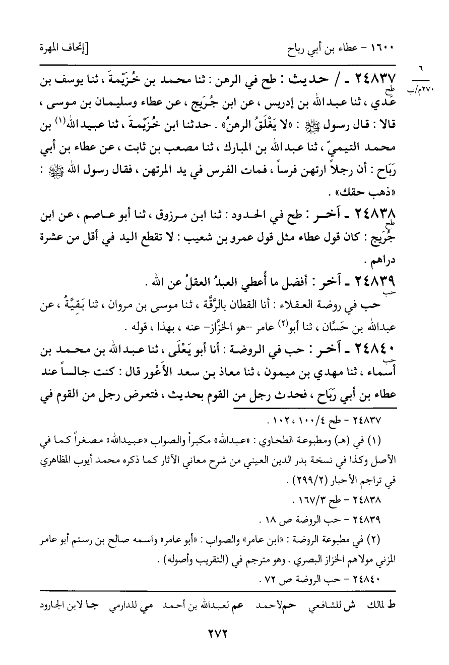 24840 - حب - آخر: حب في الروضة: أنا أبو يَعْلَى، ثنا عبد الله بن محمد بن أسماء، ثنا مهدي بن ميمون، ثنا معاذ بن سعد الأَعْور قال: كنت جالساً عند عطاء بن أبي رَبَاح، فحدث رجل من القوم بحديث، فتعرض رجل من القوم في