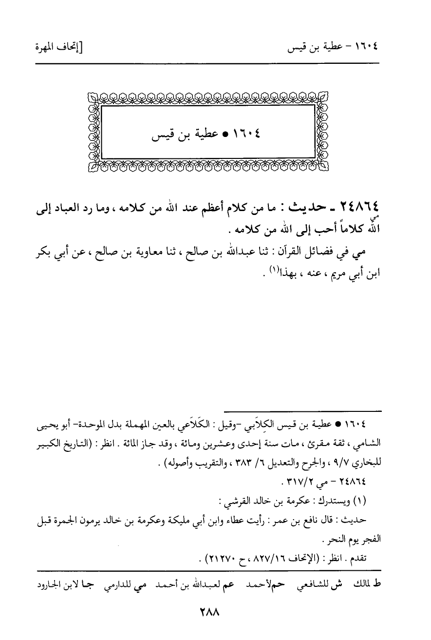 24864 - مي - حديث: ما من كلام أعظم عن الله من كلامه، وما رد العباد إلى الله كلاماً أحب إلى الله من كلامه. مي في فضائل القرآن: ثنا عبد الله بن صالح، ثنا معاوية بن صالح، عن أبي بكر ابن أبي مريم، عنه، بهذا.