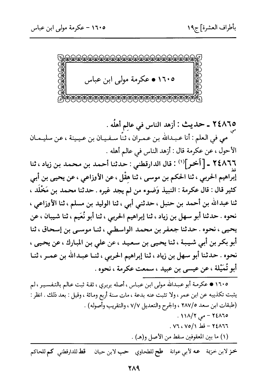 24865 - مي - حديث: أزهد الناس في عالِم أهلُه. مي في العلم: أنا عبد الله بن عمران، ثنا سفيان بن عيينة، عن سليمان الأحول، عن عكرمة قال: أزهد الناس في عالم أهله.