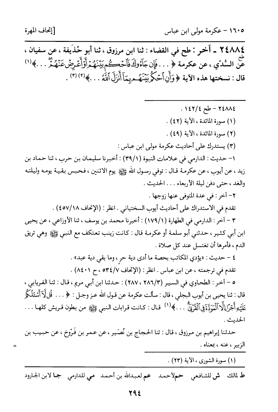 24884 - طح - آخر: طح في القضاء: ثنا ابن مرزوق، ثنا أبو حُذَيفة، عن سفيان، عن السُّدّي، عن عكرمة { ... فَإِن جَآءُوكَ فَاحْكُم بَيْنَهُمْ أَوْ أَعْرِضْ عَنْهُمْ ... } قال: نسختها هذه الآية {وَأَنِ احْكُم بَيْنَهُم بِمَآ أّنزَلَ اللهُ ... }