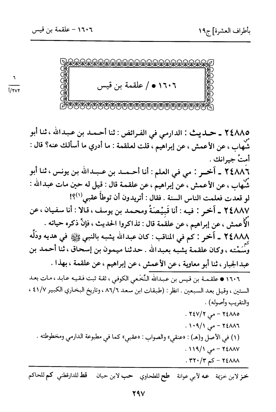 24886 - مي - آخر: مي في العلم: أنا أحمد بن عبد الله بن يونس، ثنا أبو شهاب، عن الأعمش، عن إبراهيم، عن علقمة قال: قيل له حين مات عبد الله: لو قعدت فعلمت الناس السنة. فقال: أتريدون أن توطأَ عقبي؟!