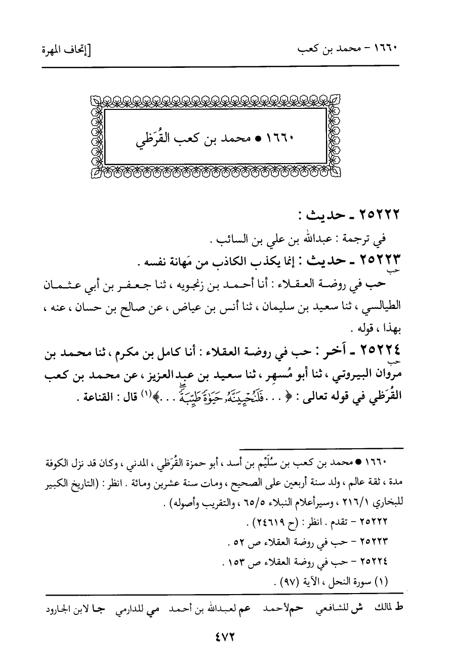 25224 - حب - آخر: حب في روضة العقلاء: أنا كامل بن مكرم، ثنا محمد بن مروان البيروتي، ثنا أبو مُسهِر، ثنا سعيد بن عبد العزيز، عن محمد بن كعب القُرَظي في قوله تعالى: { ... فَلَنُحْيِيَنَّهُ حَيَوةً طَيِّبَةً ... } قال: القناعة.