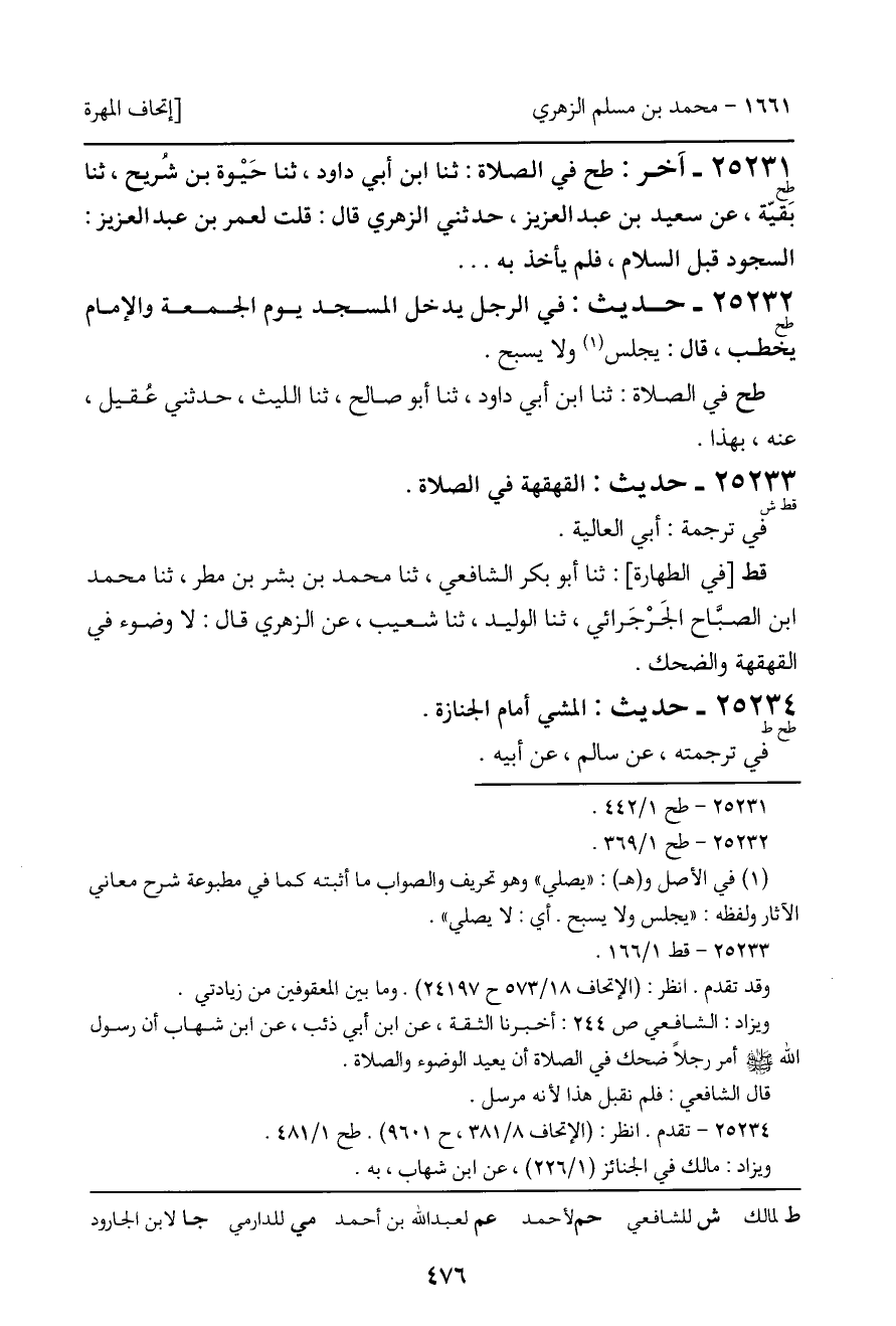 25231 - طح - آخر: طح في الصلاة: ثنا ابن أبي داود، ثنا حَيْوة بن شُريح، ثنا بَقيّة، عن سعيد بن عبد العزيز، حدثني الزهري قال: قلت لعمر بن عبد العزيز: السجود قبل السلام، فلم يأخذ به ...