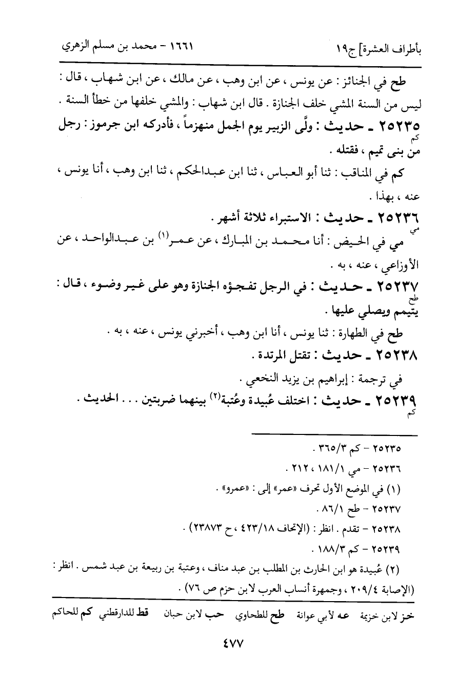 25235 - كم - حديث: ولَّى الزبير يوم الجمل منهزماً، فأدركه ابن جرموز: رجل من بنى تميم، فقتله. كم في المناقب: ثنا أبو العباس، ثنا ابن عبد الحكم، ثنا ابن وهب، أنا يونس، عنه، بهذا.