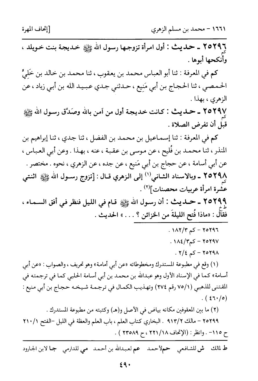 25296 - كم - حديث: أول امرأة تزوجها رسول الله صلى الله عليه وسلم خديجة بنت خويلد، وأنكحها أبوها. كم في المعرفة: ثنا أبو العباس محمد بن يعقوب، ثنا محمد بن خالد بن خَلِيٍّ الحمصي، ثنا الحجاج بن أبي مَنِيع، حدثني جدي عبيد الله بن أبي زياد، عن الزهري، بهذا.