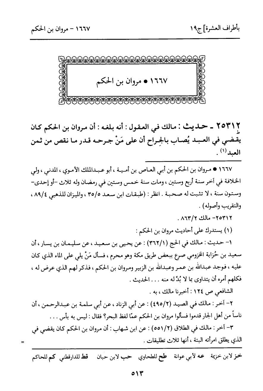 25312 - حديث (ط) : مالك في العقول: أنه بلغه: أن مروان بن الحكم كان يقضي في العبد يُصاب بالجِراح أن على مَنْ جرحه قدر ما نقص من ثمن العبد.