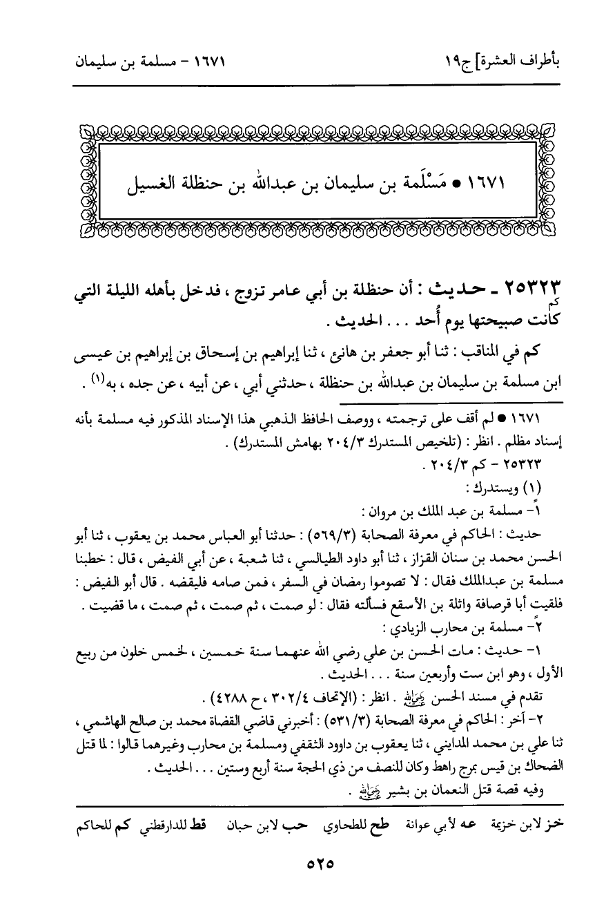 25323 - حديث (كم) : أن حنظلة بن أبي عامر تزوج، فدخل بأهله الليلة التي كانت صبيحتها يوم أحد ... الحديث.