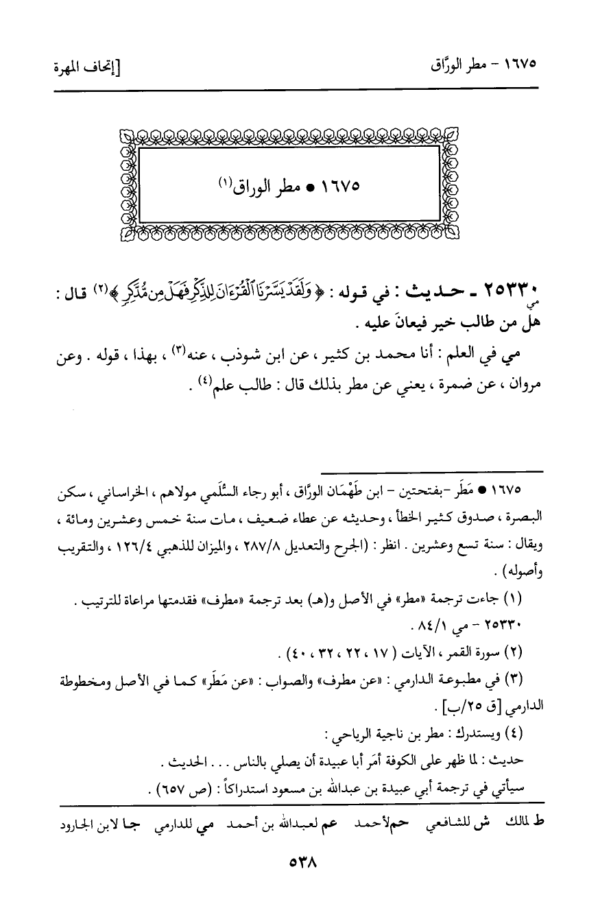 مي في العلم: أنا محمد بن كثير، عن ابن شوذب، عنه، بهذا، قوله. وعن مروان، عن ضمرة، يعني عن مطر بذلك قال: طالب علم.