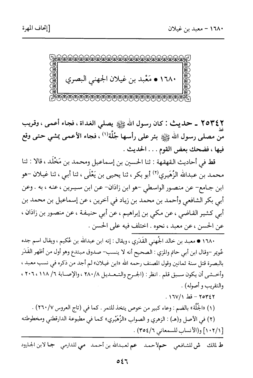 قط في أحاديث القهقهة: ثنا الحسين بن إسماعيل ومحمد بن مَخْلَد، قالا: ثنا محمد بن عبد الله الزهَيري أبو بكر، ثنا يحيى بن يَعْلَى، ثنا أبي، ثنا غيلان - هو ابن جامع - عن منصور الواسطي - هو ابن زاذان - عن ابن سيرين، عنه، به. وعن أبي بكر الشافعي وأحمد بن محمد بن زياد في آخرين، عن إسماعيل بن محمد بن أبي كثير القاضي، عن مكي بن إبراهيم، عن أبي حنيفة، عن منصور بن زاذان، عن الحسن، عن معبد، نحوه. اختلف فيه على الحسن.
