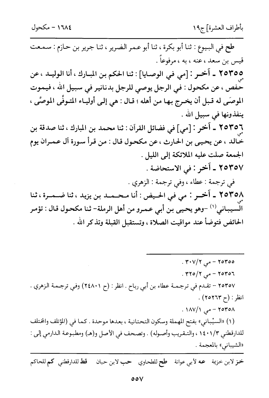 25358 - آخر (مي) : مي في الحيض: أنا محمد بن يزيد، ثنا ضمرة، ثنا السيباني - وهو يحيى بن أبي عمرو من أهل الرملة - ثنا مكحول قال: تؤمر الحائض فتوضأ عند مواقيت الصلاة، وتستقبل القبلة وتذكر الله.