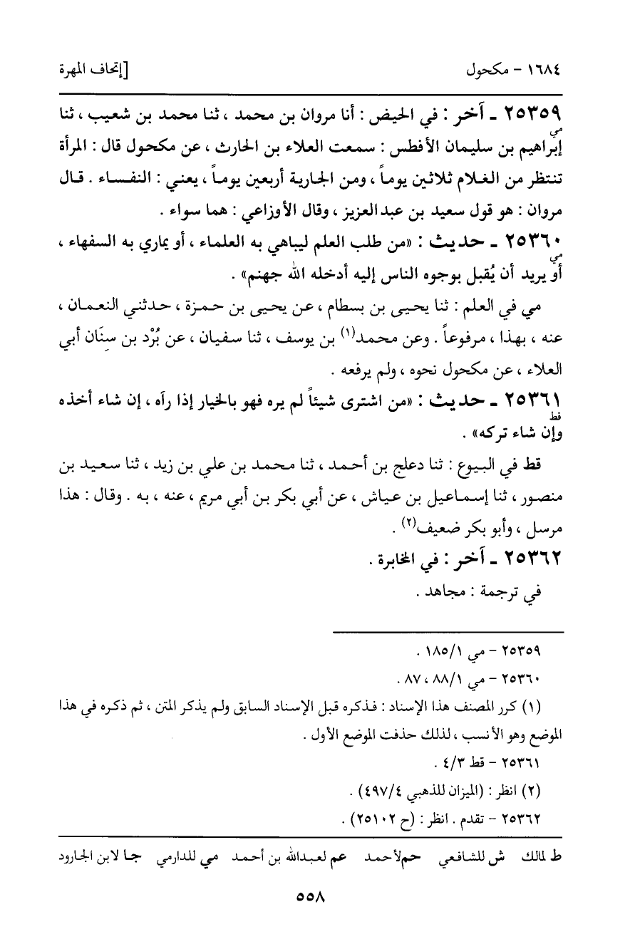 مي في العلم: ثنا يحيى بن بسطام، عن يحيى بن حمزة، حدثني النعمان، عنه، بهذا، مرفوعاً. وعن محمد بن يوسف، ثنا سفيان، عن برْد بن سِنَان أبي العلاء، عن مكحول نحوه، ولم يرفعه.