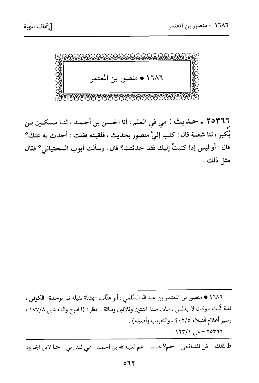 25366 - حديث (مي) : مي في العلم: أنا الحسن بن أحمد، ثنا مسكين بن بُكير، ثنا شعبة قال: كتب إليَّ منصور بحديث، فلقيته فقلت: أحدث به عنك؟ قال: أو ليس إذا كتبتُ إليك فقد حدثتك؟ قال: وسألت أيوب السختياني؟ فقال مثل ذلك.