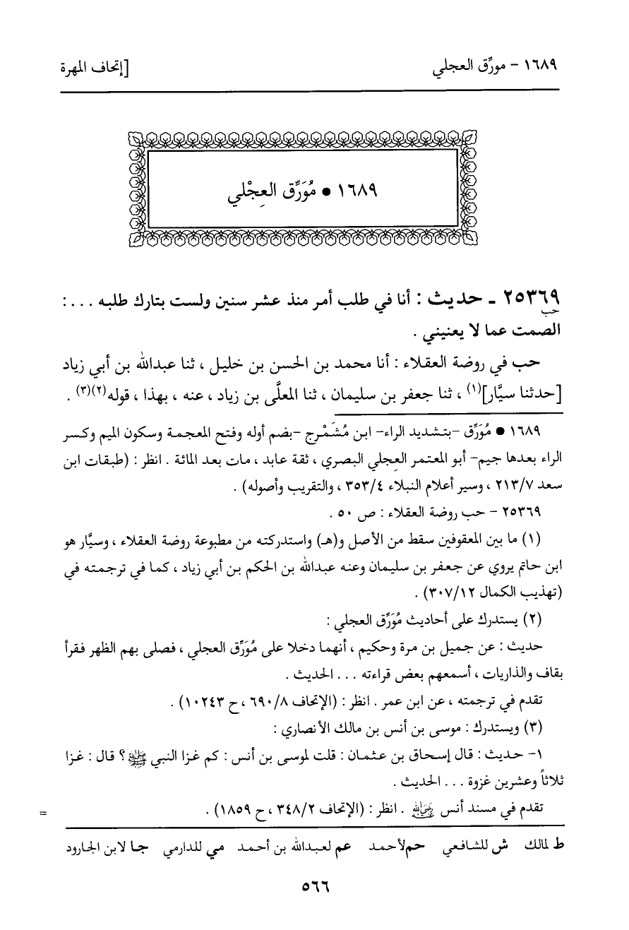 حب في روضة العقلاء: أنا محمد بن الحسن بن خليل، ثنا عبد الله بن أبي زياد [حدثنا سيَّار] ، ثنا جعفر بن سليمان، ثنا المعلَّى بن زياد، عنه، بهذا، قوله.