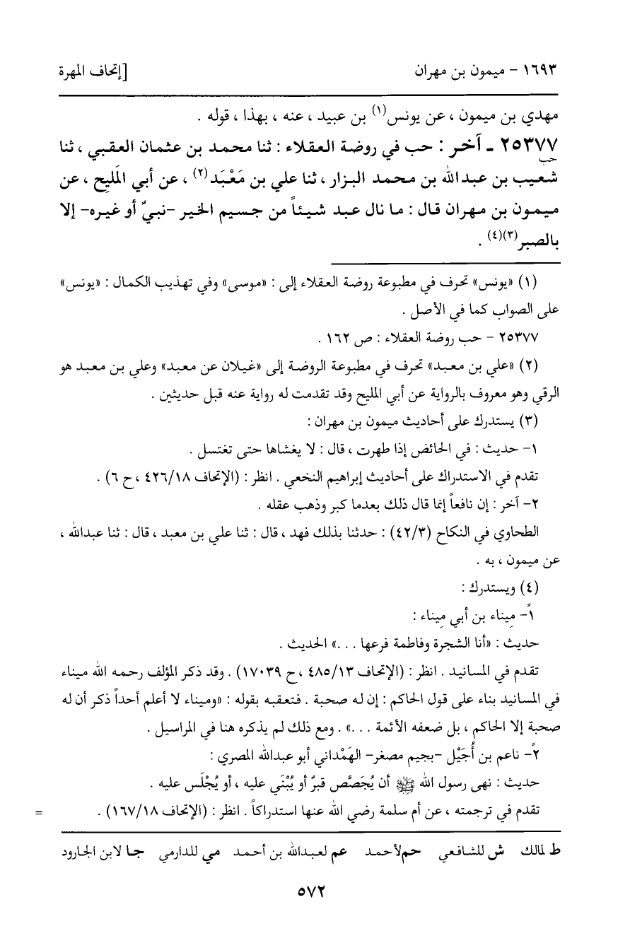 25377 - آخر (حب) : حب في روضة العقلاء: ثنا محمد بن عثمان العقبي، ثنا شعيب بن عبد الله بن محمد البزار، ثنا علي بن مَعْبَد، عن أبي المَليِح، عن ميمون بن مهران قال: ما نال عبد شيئاً من جسيم الخير - نبي أو غيره - إلا بالصبر.