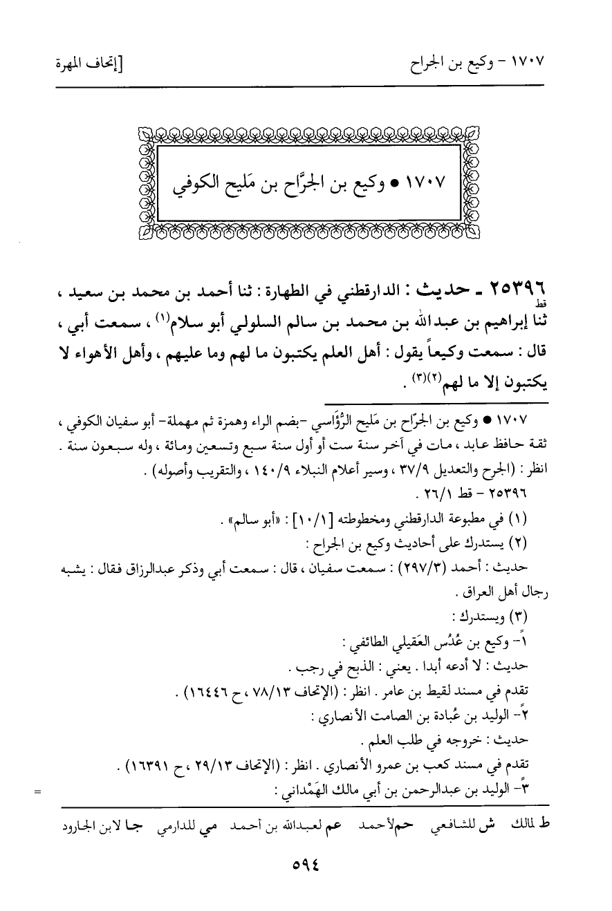 25396 - حديث (قط) : الدارقطني في الطهارة: ثنا أحمد بن محمد بن سعيد، ثنا إبراهيم بن عبد الله بن محمد بن سالم السلولي أبو سلام، سمعت أبي، قال: سمت وكيعاً يقول: أهل العلم يكتبون ما لهم وما عليهم، وأهل الأهواء لا يكتبون إلا ما لهم.