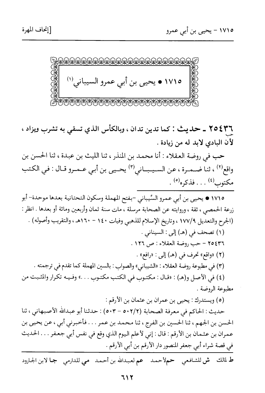 حب في روضة العقلاء: أنا محمد بن المنذر، ثنا الليث بن عبدة، ثنا الحسن بن واقع، ثنا ضمرة، عن السيباني يحيى بن أبي عمرو قال: في الكتب مكتوب ... فذكره.