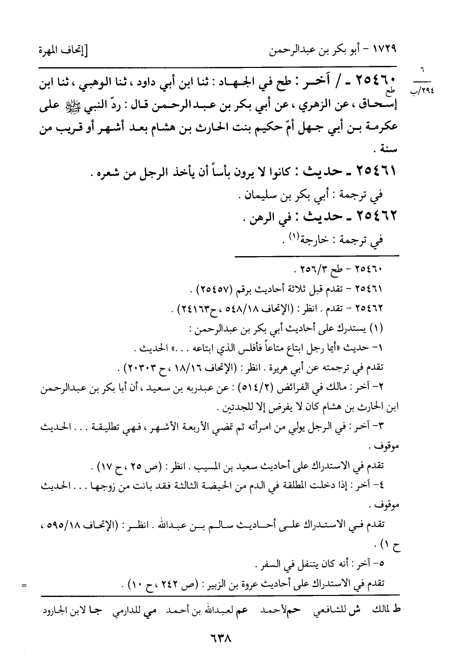 25460 - آخر (طح) : طح في الجهاد: ثنا ابن أبي داود، ثنا الوهبي، ثنا ابن إسحاق، عن الزهري، عن أبي بكر بن عبد الرحمن قال: ردّ النبي - صَلَّى اللَّهُ عَلَيْهِ وَسَلَّمَ - على عكرمة بن أبي جهل أمّ حكيم بنت الحارث بن هشام بعد أشهر أو قريب من سنة.