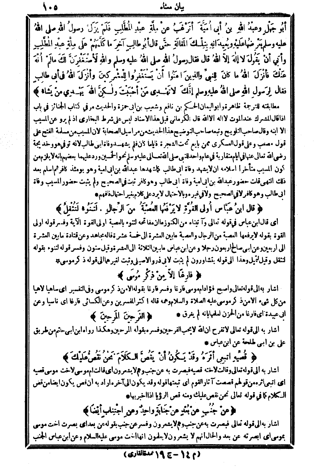 أبُو جَهْلٍ وعَبْدُ الله بنُ أبي أُمَيَّةَ أتَرْغَبُ عَنْ مِلَّةِ عَبْدِ المُطَّلِبِ فَلَمْ يَزَلْ رسولُ الله صلى الله عَلَيْهِ وَسلم يَعْرِضُها عَلَيْهِ وَيُعِيدَانِهِ بِتِلْكَ المَقالَةِ حَتَّى قَالَ أبُو طالِبٍ آخِرَ مَا كَلَّمَهُمْ عَلَى مِلَّةِ عَبْدِ المُطَّلِبِ وَأبي أَن يَقُولَ لَا إل هَ إلاَّ الله قَالَ فَقَالَ رسولُ الله صلى الله عَلَيْهِ وَسلم لأسْتَغْفِرَنَّ لَكَ مَا لَمْ أنْهَ عَنْكَ فأنْزَلَ الله: {مَا كانَ لِلنبيِّ والذِينَ آمَنُوا أَنْ يَسْتَغْفِرُوا لِلْمشْرِكِين} (التَّوْبَة: 311) وأنْزَلَ الله فِي أبي طَالب فَقَالَ لِرَسولِ الله صلى الله عَلَيْهِ وَسلم: {إنَّكَ لَا تَهْدِي مَنْ أحْبَبْتَ وَلاكِنَّ الله يَهْدِي مَنْ يَشاءُ} (الْقَصَص: 65) ..