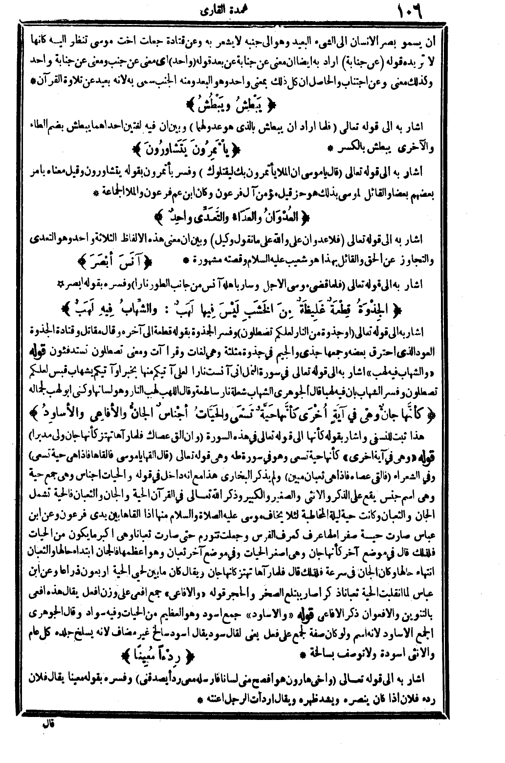 هَذَا ثَبت للنسفي، وَأَشَارَ بقوله: (كَأَنَّهَا) إِلَى قَوْله تَعَالَى فِي هَذِه السُّورَة: {وَأَن ألق عصاك فَلَمَّا رَآهَا تهتز كَأَنَّهَا جَان ولى مُدبرا} (الْقَصَص: 13) قَوْله: (وَهِي فِي آيَة أُخْرَى) {كَأَنَّهَا حَيَّة تسْعَى} (طه: 02) وَهُوَ فِي سُورَة طه، وَهِي قَوْله تَعَالَى: {قَالَ: القها يَا مُوسَى فألقاها فَإِذا هِيَ حَيَّة تسْعَى} وَفِي الشُّعَرَاء: {فَألْقى عَصَاهُ فَإِذا هِيَ ثعبان مُبين} (الْأَعْرَاف: 701 وَالشعرَاء: 23) وَلم يذكر البُخَارِيّ هَذَا مَعَ أَنه دَاخل فِي قَوْله: (والحيات أَجنَاس) وَهِي جمع حَيَّة وَهِي إسم جنس يَقع على الذّكر وَالْأُنْثَى وَالصَّغِير وَالْكَبِير، وَذكر الله تَعَالَى فِي الْقُرْآن الْحَيَّة والجان والثعبان، فالحية تَشْمَل الجان والثعبان، وَكَانَت حَيَّة لَيْلَة المخاطبة لِئَلَّا يخَاف مُوسَى علهي الصَّلَاة وَالسَّلَام، مِنْهَا إِذا أَلْقَاهَا بَين يَدي فِرْعَوْن، وَعَن ابْن عَبَّاس: صَارَت حَيَّة صفراء لَهَا عرف كعرف الْفرس، وَجعلت تتورم حَتَّى صَارَت ثعباناً وَهِي أكبر مَا يكون من الْحَيَّات فَلذَلِك قَالَ فِي مَوضِع آخر: {كَأَنَّهَا جَان} وَهِي أَصْغَر الْحَيَّات وَفِي مَوضِع آخر: ثعبان، وَهُوَ أعظمها، فالجان ابْتِدَاء حَالهَا والثعبان. انْتِهَاء حَالهَا، وَكَانَ الجان فِي سرعَة فَلذَلِك قَالَ: {فَلَمَّا رَآهَا تهتز كَأَنَّهَا جَان} وَيُقَال: كَانَ مَا بَين لحيي الْحَيَّة أَرْبَعُونَ ذِرَاعا، وَعَن ابْن عَبَّاس: لما انقلبت الْحَيَّة ثعباناً ذكرا صَار يبتلع الصخر وَالْحجر. قَوْله: (والأفاعي) جمع أَفْعَى على وزن أفعل، يُقَال: هَذِه أَفْعَى بِالتَّنْوِينِ، والأفعوان ذكر الأفاعي. قَوْله: (والأساود) ، جمع أسود وَهُوَ الْعَظِيم من الْحَيَّات وَفِيه سَواد، وَقَالَ الْجَوْهَرِي: الْجمع الأساود لِأَنَّهُ إسم، وَلَو كَانَ صفة لجمع على فعل يَعْنِي لقَالَ: سود، يُقَال: أسود سالخ غير مُضَاف لِأَنَّهُ يسلخ جلده كل عَام وَالْأُنْثَى: أَسْوِدَة، وَلَا تُوصَف بسالخة.