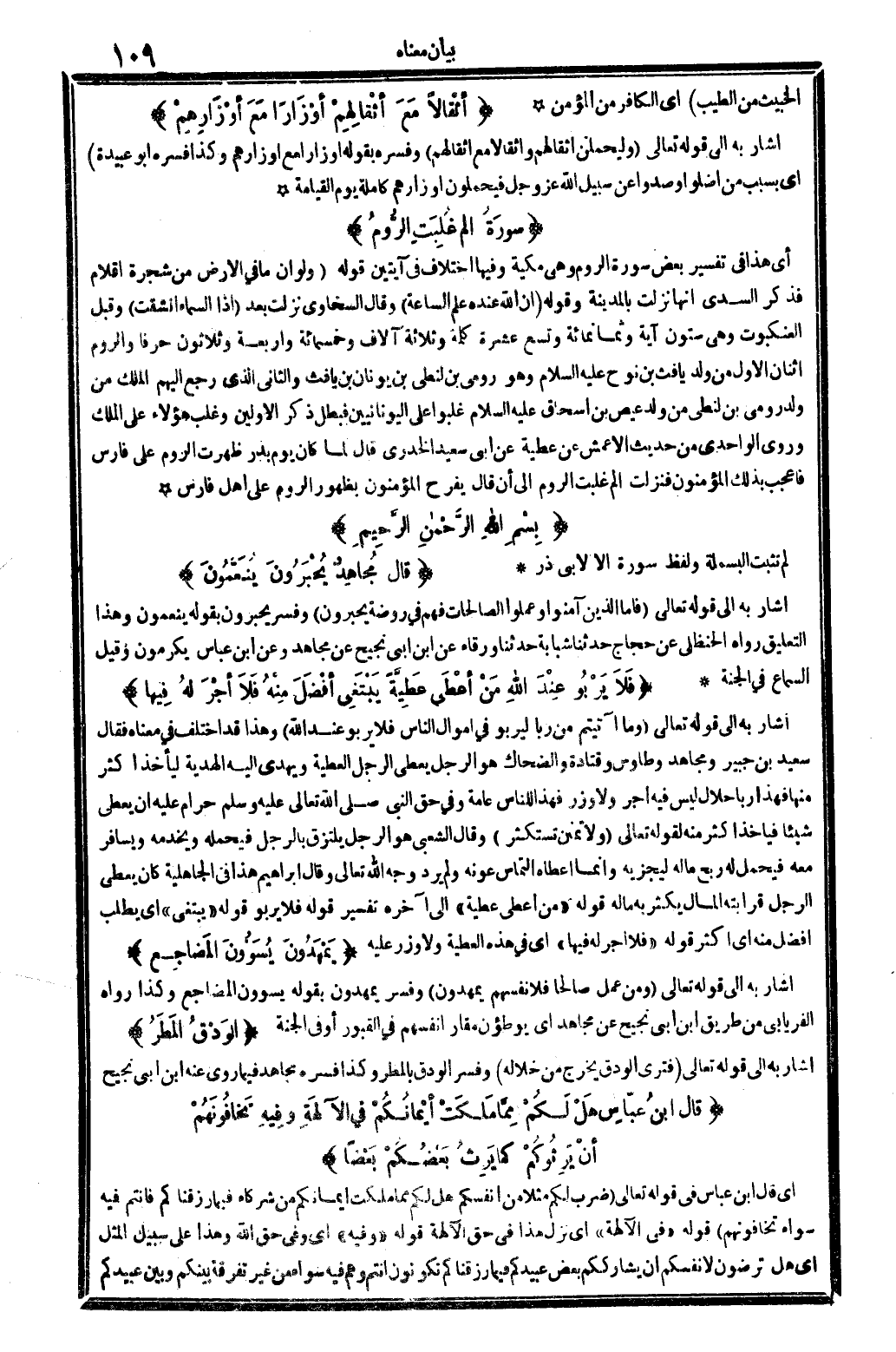 أَي: هَذَا فِي تَفْسِير بعض سُورَة الرّوم، وَهِي مَكِّيَّة وفيهَا اخْتِلَاف فِي آيَتَيْنِ، قَوْله: {وَلَو أَن مَا فِي الأَرْض من شَجَرَة أَقْلَام} (لُقْمَان: 72) فَذكر السّديّ أَنَّهَا نزلت بِالْمَدِينَةِ، وَقَوله: {وَإِن الله عِنْده علم السَّاعَة} (لُقْمَان: 43) وَقَالَ السخاوي: نزلت بعد: {إِذا السَّمَاء انشقت} (الانشقاق: 1) وَقبل العنكبوت، وَهِي سِتُّونَ آيَة، وَثَمَانمِائَة وتسع عشرَة كلمة، وَثَلَاثَة آلَاف وَخَمْسمِائة وَأَرْبَعَة وَثَلَاثُونَ حرفا، وَالروم إثنان: الأول: من ولد يافث بن نوح عَلَيْهِ السَّلَام، وَهُوَ رومي بن لنطي بن يونان بن يافث، الثَّانِي: الَّذِي رَجَعَ إِلَيْهِم الْملك من ولد رومي بن لنطي من ولد عيص بن إِسْحَاق عَلَيْهِ السَّلَام، غلبوا على اليونانيين فَبَطل ذكر الْأَوَّلين وَغلب هَؤُلَاءِ على الْملك. وروى الواحدي من حَدِيث الْأَعْمَش: عَن عَطِيَّة عَن أبي سعيد الْخُدْرِيّ، قَالَ: لما كَانَ يَوْم بدر ظَهرت الورم على فَارس فأعجب بذلك الْمُؤْمِنُونَ، فَنزلت {ألم غلبت الرّوم} (الرّوم: 1 2) إِلَى أَن قَالَ: يفرح الْمُؤْمِنُونَ بِظُهُور الرّوم على أهل فَارس.