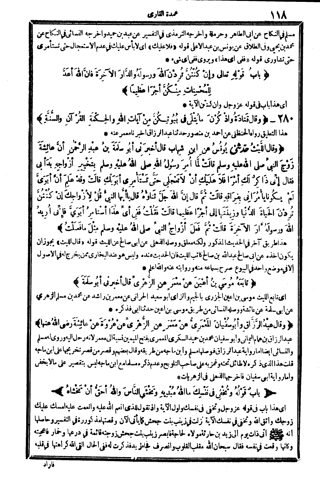 5 - (بَابُ قَوْلِهِ تَعَالَى: {وَإنْ كُنْتُنَّ تُرِدْنَ الله وَرَسُولَهُ وَالدَّارُ الآخُرَةَ فَإنَّ الله أعَدَّ لِلْمُحْسِنَاتِ مِنْكُنَّ أجْرا عَظِيما} (الرحمان: 92)