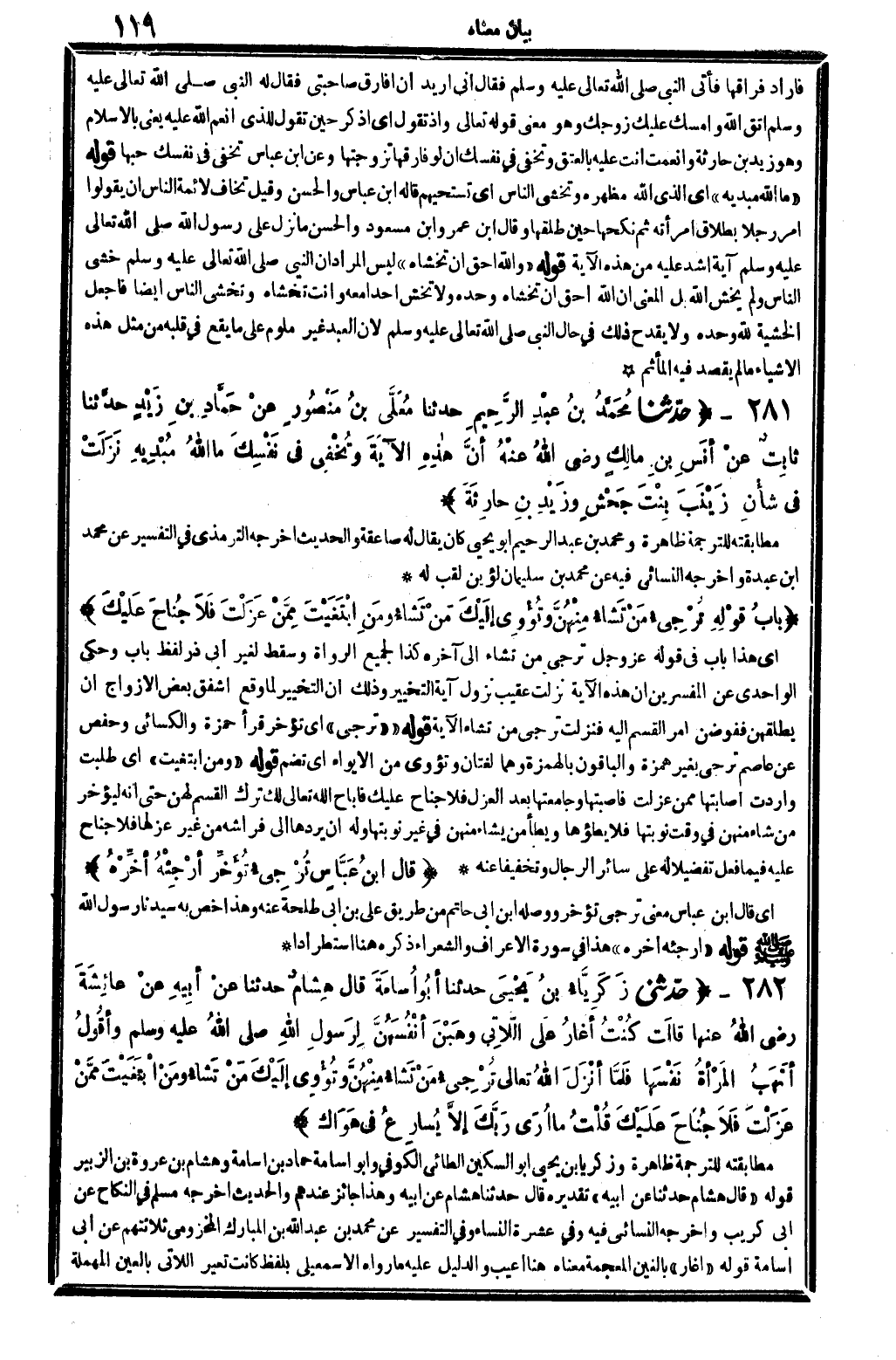 أَي: هَذَا بَاب فِي قَوْله عز وَجل: {ترجىء من تشَاء} إِلَى آخِره، كَذَا جَمِيع الروَاة، لغير أبي ذَر لفظ: بَاب، وَحكى الواحدي عَن الْمُفَسّرين: أَن هَذِه الْآيَة نزلت عقيب نزُول آيَة التَّخْيِير، وَذَلِكَ أَن التَّخْيِير لما وَقع أشْفق بعض الْأزْوَاج أَن يُطَلِّقهُنَّ ففوضن أَمر الْقسم إِلَيْهِ فَنزلت {ترجىء من تشَاء} الْآيَة. قَوْله: (ترجىء) ، أَي: تُؤخر، قَرَأَ حَمْزَة وَالْكسَائِيّ وَحَفْص عَن عَاصِم: تجىء بِغَيْر همزَة وَالْبَاقُونَ بِالْهَمْزَةِ، وهما لُغَتَانِ (وَتُؤْوِي) من الإيواء أَي: تضم قَوْله: (وَمن ابْتَغَيْت) ، أَي: طلبت وَأَرَدْت إصابتها مِمَّن عزلت فأصبتها وجامعتها بعد الْعَزْل فَلَا جنَاح عَلَيْك، فأباح الله تَعَالَى لَك ترك الْقسم لَهُنَّ حَتَّى إِنَّه ليؤخر من شَاءَ مِنْهُنَّ فِي وَقت نوبتها فَلَا يَطَؤُهَا ويطأ من يَشَاء مِنْهُنَّ فِي غير نوبتها، وَله أَن يردهَا إِلَى فرَاشه من غير عزلها، فَلَا جنَاح عَلَيْهِ فِيمَا فعل تَفْضِيلًا لَهُ على سَائِر الرِّجَال وتخفيفا عَنهُ.