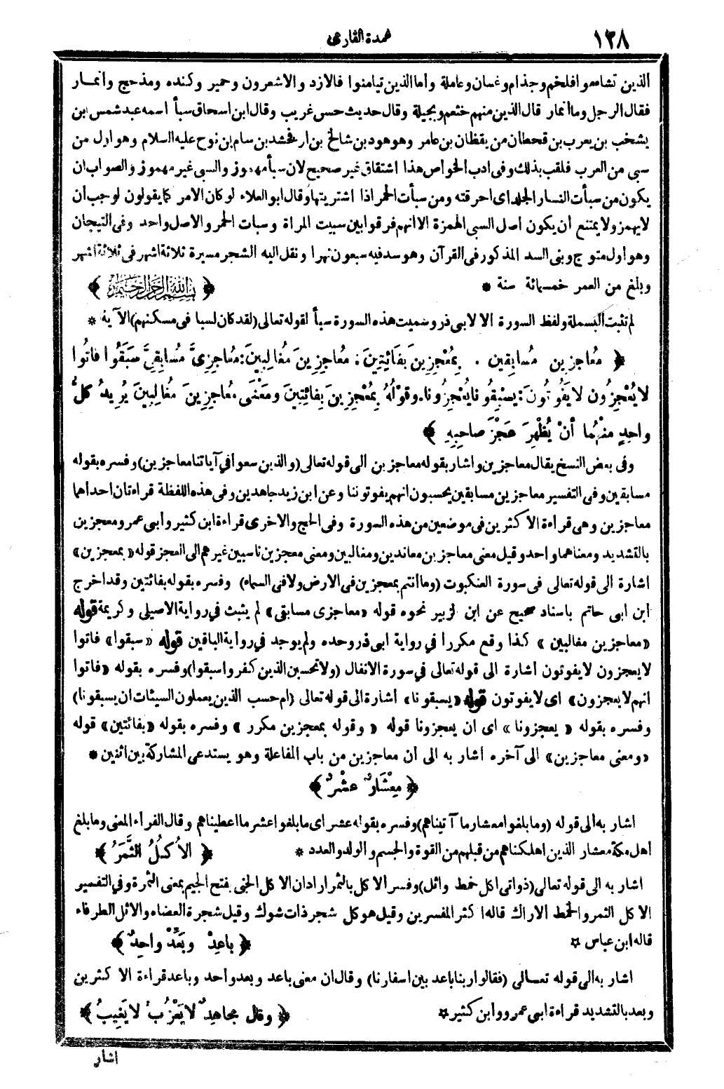 وَفِي بعض النّسخ يُقَال: معاجزين، وَأَشَارَ بقوله: معاجزين إِلَى قَوْله تَعَالَى: {وَالَّذين سعوا فِي آيَاتنَا معاجزين} (سبإ: 5) وَفَسرهُ بقوله: (مسابقين) وَفِي التَّفْسِير: معاجزين مسابقين يحسبون أَنهم يفوتوننا، وَعَن ابْن زيد: جاهدين، وَفِي هَذِه اللَّفْظَة قراءتان: إِحْدَاهمَا: معاجزين، وَهِي قِرَاءَة الْأَكْثَرين فِي موضِعين من هَذِه السُّورَة وَفِي الْحَج. وَالْأُخْرَى: قِرَاءَة ابْن كثير وَأبي عَمْرو: معجزين، بِالتَّشْدِيدِ ومعناهما وَاحِد، وَقيل: معنى معاجزين معاندين ومغالبين، وَمعنى: معجزين ناسبين غَيرهم إِلَى الْعَجز. قَوْله: (بمعجزين) إِشَارَة إِلَى قَوْله تَعَالَى فِي سُورَة العنكبوت. {وَمَا أَنْتُم بمعجزين فِي الأَرْض وَلَا فِي السَّمَاء} (العنكبوت: 22) . وَفَسرهُ بقوله: (بفائتين) . وَقد أخرج ابْن أبي حَاتِم بِإِسْنَاد صَحِيح عَن ابْن الزبير نَحوه. قَوْله: (معاجزي: مسابقي) ، لم يثبت فِي رِوَايَة الْأصيلِيّ وكريمة. قَوْله: (معاجزين مغالبين) ، كَذَا وَقع مكرراً فِي رِوَايَة أبي ذَر وَحده وَلم يُوجد فِي رِوَايَة البَاقِينَ. قَوْله: (سبقوا: فَأتوا لَا يعجزون لَا يفوتون) إِشَارَة إِلَى قَوْله تَعَالَى فِي سُورَة الْأَنْفَال: {وَلَا تحسبن الَّذين كفرُوا سبقوا} (الْأَنْفَال: 95) وَفَسرهُ بقوله: (فَأتوا إِنَّهُم لَا يعجزون) ، أَي: لَا يفوتون. قَوْله: (يسبقونا) إِشَارَة إِلَى قَوْله تَعَالَى: {أم حسب الَّذين يعْملُونَ السَّيِّئَات أَن يسبقونا} (العنكبوت: 4) وَفَسرهُ بقوله: (يعجزونا) ، أَي: أَن يعجزونا. قَوْله: (وَقَوله بمعجزين مُكَرر) ، وَفَسرهُ بقوله: (بفائتين) ، قَوْله: (وَمعنى: معاجزين)