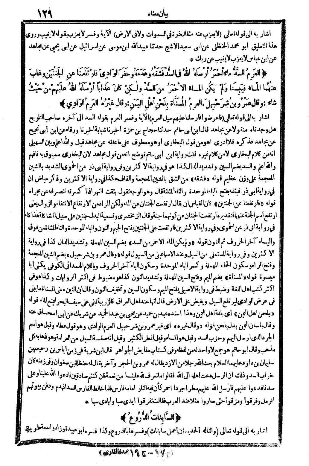 إِلَى آخِره، صَاحب (التَّلْوِيح) : هَل وَجَدْنَاهُ مَنْقُولًا عَن مُجَاهِد؟ قَالَ ابْن أبي حَاتِم: حَدثنَا حجاج بن حَمْزَة أخبرنَا أخبرنَا شَبابَة أخبرنَا وَرْقَاء عَن ابْن أبي نجيح عَن مُجَاهِد، فَذكره، فَلَا أَدْرِي أهوَ من قَول البُخَارِيّ أَو هُوَ مَعْطُوف على مَا علقه عَن مُجَاهِد قبل؟ وَالله أعلم. وبيَّن السُّهيْلي أَنه من كَلَام البُخَارِيّ لَا من كَلَام غَيره. قلت: رِوَايَة ابْن أبي حَاتِم توضح أَنه من قَول مُجَاهِد لِأَن البُخَارِيّ مَسْبُوق بِهِ، فَافْهَم. وَالله أعلم. (والسد) بِضَم السِّين وَتَشْديد الدَّال، كَذَا هُوَ فِي رِوَايَة الْأَكْثَرين، وَفِي رِوَايَة أبي ذَر عَن الْحَمَوِيّ الشَّديد، بالشين الْمُعْجَمَة على وزن عَظِيم. قَوْله: (فشقه) ، من الشق بالشين الْمُعْجَمَة وَالْقَاف، هَكَذَا فِي رِوَايَة الْأَكْثَرين، وَذكر عِيَاض أَن فِي رِوَايَة أبي ذَر: فبثقه، بِفَتْح الْبَاء الْمُوَحدَة وَالتَّاء الْمُثَلَّثَة، قَالَ: وَهُوَ الْوَجْه، تَقول: بثقت النَّهر إِذا كَسرته لتصرفه عَن مجْرَاه. قَوْله: (فارتفعتا عَن الجنتين) ، كَانَ الْقيَاس أَن يُقَال: ارْتَفَعت الجنتان عَن المَاء وَلَكِن المُرَاد من الِارْتفَاع الانتفاء، والزوال يَعْنِي ارْتَفع إسم الْجنَّة عَنْهُمَا فتقديره: ارْتَفَعت الجنتان عَن كَونهمَا جنَّة. وَقَالَ الزَّمَخْشَرِيّ: وَتَسْمِيَة الْبَدَل جنتين على سَبِيل المشاكلة، هَذَا كُله فِي رِوَايَة أبي ذَر عَن الْحَمَوِيّ، وَفِي رِوَايَة الْأَكْثَرين: فارتفعت على الجنتين، بِفَتْح الْجِيم وَالنُّون وَالْبَاء الْمُوَحدَة وَالتَّاء الْمُثَنَّاة من فَوق وَالْيَاء آخر الْحُرُوف ثمَّ النُّون قَوْله: (وَلم يكن المَاء الْأَحْمَر من السد) ، بِضَم السِّين الْمُهْملَة وَتَشْديد الدَّال، كَذَا فِي رِوَايَة الْأَكْثَرين، وَفِي رِوَايَة الْمُسْتَمْلِي من السَّيْل، وَعند الْإِسْمَاعِيلِيّ: من السُّيُول. قَوْله: (وَقَالَ عَمْرو بن شُرَحْبِيل) ، بِضَم الشين الْمُعْجَمَة وَفتح الرَّاء وَسُكُون الْحَاء الْمُهْملَة وَكسر الْبَاء الْمُوَحدَة وَسُكُون الْيَاء آخر الْحُرُوف وباللام: الْهَمدَانِي الْكُوفِي، يكنى أَبَا ميسرَة. قَوْله: (المسناة) ، بِضَم الْمِيم وَفتح السِّين الْمُهْملَة وَتَشْديد النُّون، كَذَا هُوَ مضبوط فِي أَكثر الرِّوَايَات وَكَذَا هُوَ فِي أَكثر كتب أهل اللُّغَة، وَضبط فِي رِوَايَة الْأصيلِيّ بِفَتْح الْمِيم وَسُكُون السِّين وَتَخْفِيف النُّون، وَقَالَ ابْن التِّين: معنى المسناة مَا يبْنى فِي عرض الْوَادي ليرتفع السَّيْل وَيفِيض على الأَرْض، قَالَ: إِنَّهَا عِنْد أهل الْعرَاق كالزريبة تبنى على سيف الْبَحْر ليمنع المَاء. قَوْله: (بلحن أهل الْيمن) ، أَي: بلغَة أهل الْيمن، وَهَذَا أسْندهُ عبد بن حميد عَن يحيى بن عبد الحميد عَن شريك عَن أبي إِسْحَاق عَنهُ، وَقَالَ بِلِسَان الْيمن بدل بلحن. قَوْله: (وَقَالَ غَيره) ، أَي: غير عَمْرو بن شُرَحْبِيل (العرم الْوَادي) ، وَهُوَ قَول عَطاء، وَقيل: هُوَ إسم الجرد الَّذِي أرسل إِلَيْهِم (وَحرب السد) وَقيل: هُوَ المَاء، وَقيل: الْمَطَر الْكثير، وَقيل: إِنَّه صفة السَّيْل من العرامة وَهُوَ ذَهَابه كل مَذْهَب، وَقَالَ أَبُو حَاتِم: هُوَ جمع لَا وَاحِد لَهُ من لَفظه، وَفِي كتاب: (مفايض الْجَوَاهِر) : قَالَ ابْن شربة: فِي زمن إِيَاس بن رحيعم بن سُلَيْمَان بن دَاوُد عَلَيْهِمَا السَّلَام، بعث الله رجلا من الأزد يُقَال لَهُ عَمْرو بن الْحجر وَآخر يُقَال لَهُ حَنْظَلَة بن صَفْوَان، وَفِي زَمَنه كَانَ خراب السد، وَذَلِكَ أَن الرُّسُل دعت أَهله إِلَى الله فَقَالُوا: مَا نَعْرِف لله علينا من نعْمَة، فَإِن كُنْتُم صَادِقين فَادعوا الله علينا وعَلى سدنا، فدعوا عَلَيْهِم، فَأرْسل الله عَلَيْهِم مَطَرا جردا أَحْمَر كَأَن فِيهِ النَّار أَمَامه فَارس، فَلَمَّا خالط الْفَارِس ا