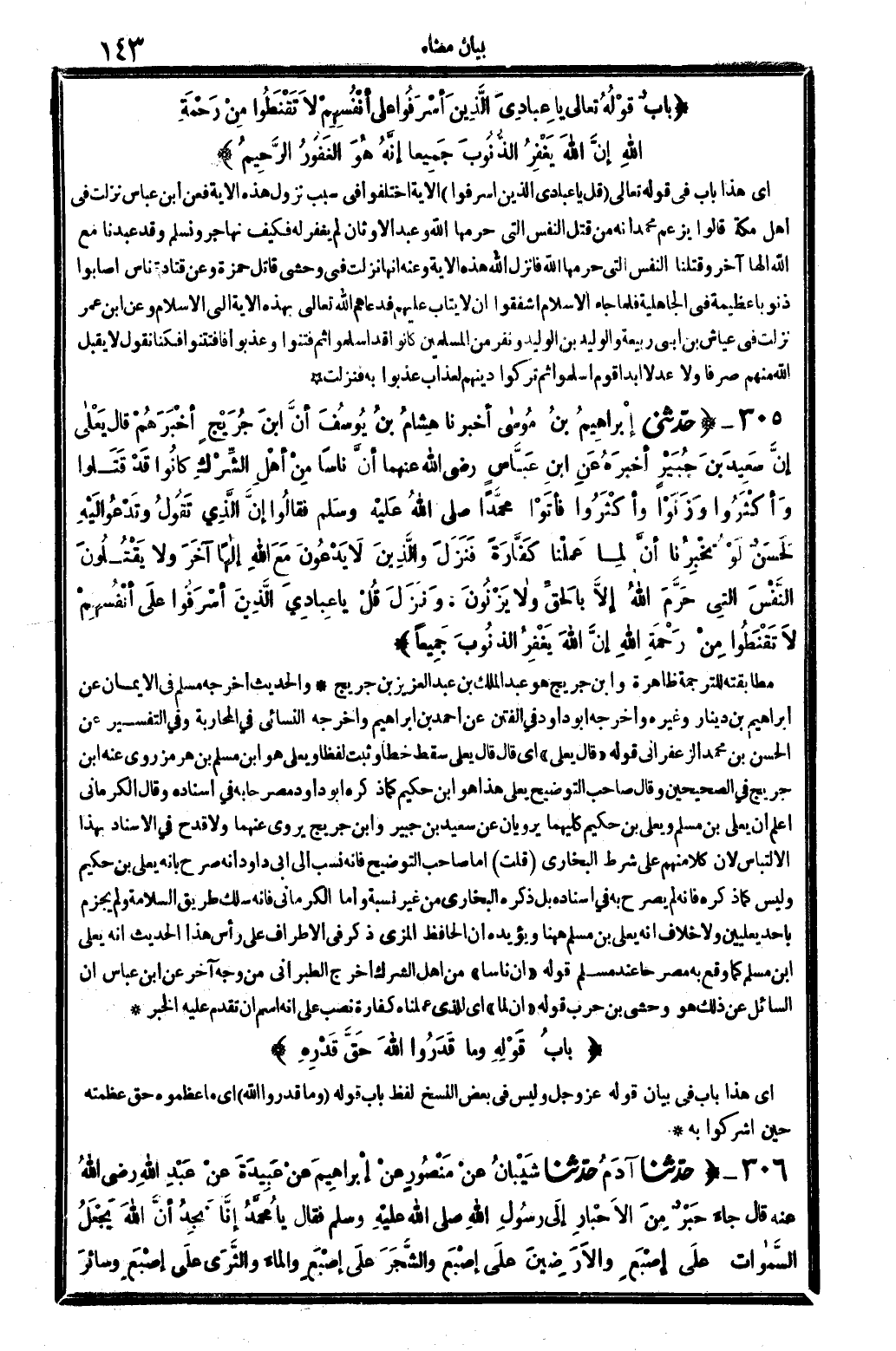 0184 - حدَّثني إبْراهِيمُ بنُ مُوساى أخبرنَا هِشامُ بنُ يُوسُفَ أنَّ ابنَ جُرَيْجٍ أخْبَرَهُمْ قَالَ يَعْلاى أنَّ سَعِيدَ بنَ جُبَيْرٍ أخبرَهُ عَنِ ابنِ عَبَّاسٍ رَضِي الله عَنْهُمَا أنَّ نَاسا مِنْ أهْلِ الشِّرْكِ كانُوا قَدْ قَتَلوا وَأكْثَرُوا وَزَنَوْا وأكْثَرُوا فأتَوْا مُحَمَّداً صلى الله عَلَيْهِ وَسلم فقالُوا إنَّ الَّذِي تَقُولُ وتَدْعُو إلَيْهِ لَحَسَنٌ لَوْ تُخْبِرُنا أنَّ لِما عَملْنا كَفَّارَةً فَنَزَلَ: {والَّذِينَ لاَ يَدْعُونَ مَعَ الله إلاهاً آخَرَ وَلَا يَقْتُلُونَ النَّفْسَ الَّتِي حَرَّمَ الله إلاَّ بالحَقِّ وَلَا يَزْنُونَ} (الْفرْقَان: 86) . وَنَزَلَ: {قُلْ يَا عِبادِيَ الَّذِينَ أسْرَفُوا عَلَى أنْفُسِهِمْ لاَ تَقْنَطُوا مِنْ رَحْمَةِ الله إنَّ الله يَغْفِرُ الذنُوبَ جَمِيعاً} .