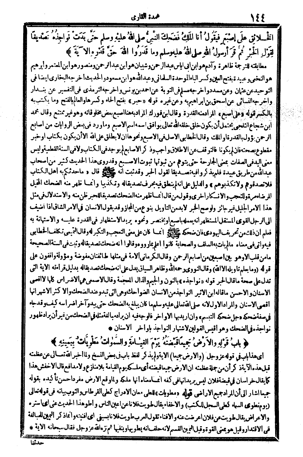 أَي: هَذَا بَاب فِي قَوْله عز وَجل: {وَالْأَرْض جَمِيعًا} الْآيَة ... وَلم يذكر لفظ: بَاب، فِي بعض النّسخ، وَلما أخبر الله تَعَالَى عَن عَظمته قبل هَذِه الْآيَة ذكر أَن من جملَة عَظمته أَن الأَرْض جَمِيعًا قَبضته أَي: ملكه يَوْم الْقِيَامَة بِلَا مُنَازع وَلَا مدافع، قَالَ الْأَخْفَش: هَذَا كَمَا يُقَال: خُرَاسَان فِي قَبْضَة فلَان، لَيْسَ يُرِيد أَنَّهَا فِي كَفه، إِنَّمَا مَعْنَاهُ أَنَّهَا ملكه، وَلما وَقع الأَرْض مُفردا حسن تأكيده بقوله: جَمِيعًا، أَشَارَ إِلَى أَن المُرَاد جَمِيع الْأَرَاضِي. قَوْله: (مَطْوِيَّات) للطي معَان: (الإدراج) : كطي القرطاس وَالثَّوْب، بَيَانه فِي قَوْله تَعَالَى: {يَوْم نطوي السَّمَاء كطي السّجل للكتب} (الْأَنْبِيَاء: 401) ، (والإخفاء) ، يُقَال: طويت فلَانا عَن أعين النَّاس، واطوِ هَذَا الحَدِيث عني أَي: استره، والإعراض، يُقَال: طويت عَن فلَان أَعرَضت عَنهُ، (والإفناء) : يَقُول الْعَرَب: طويت فلَانا بسيفي أَي أفنيته، وَإِنَّمَا ذكر الْيَمين للْمُبَالَغَة فِي الاقتدار، وَقيل: هُوَ بِمَعْنى الْقُوَّة، وَقيل: الْيَمين الْقسم لِأَنَّهُ حلف أَنه يطويها وينفيها، ثمَّ نزه الله عز وَجل فَقَالَ سُبْحَانَهُ الْآيَة.